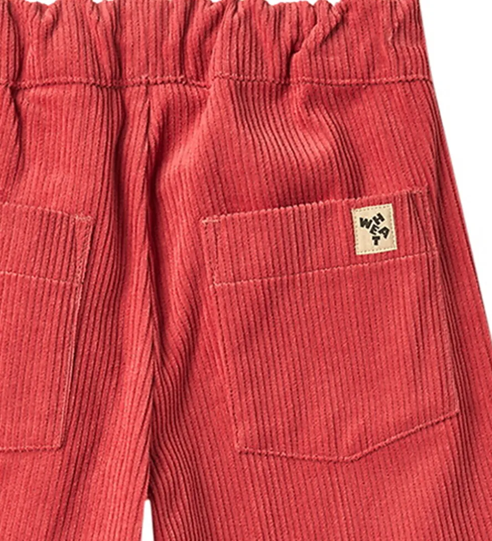 Smukke Wheat fløjlsbukser i en varm rød nuance. Wheat fløjlsbukserne har lange ben med en god vidde og en løs pasform, og i livet er der en bred, justebar elastikkant. I siderne er der praktiske lommer, og bagpå sidder der to store lommer.