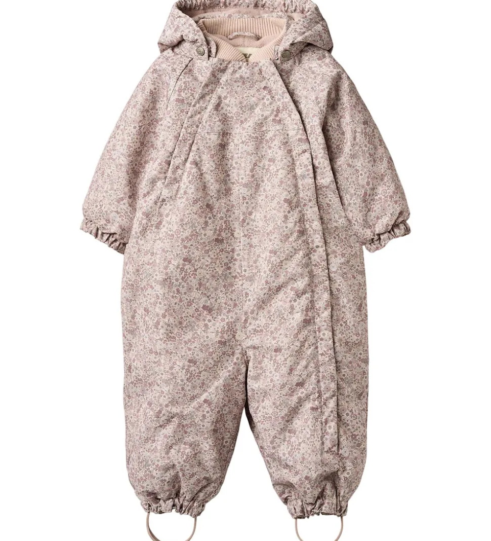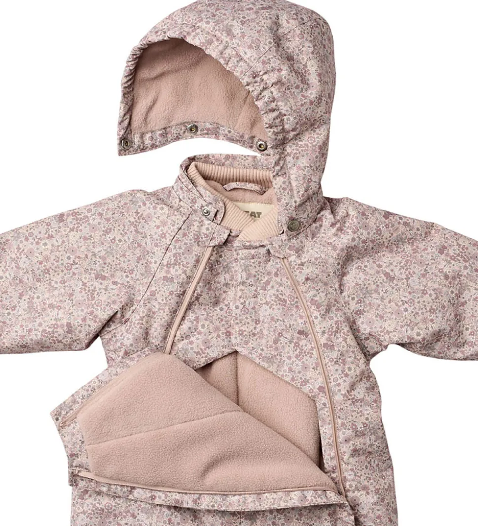 Sød Wheat flyverdragt i rosa med et alloverblomsterprint i lilla, rosa og grønne farver. Flyverdragten rummer også både reflekspipings og -print.