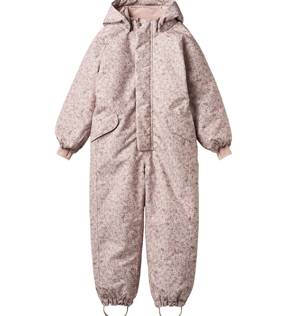 Skøn Wheat flyverdragt i rosa med et alloverblomsterprint i lilla, rosa og grønne farver. Flyverdragten rummer også både reflekspipings og -print.