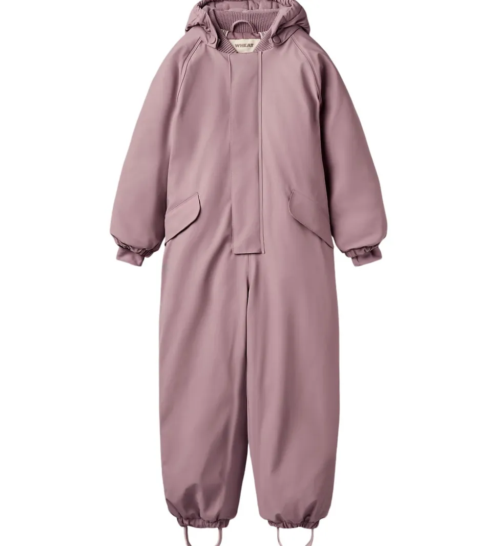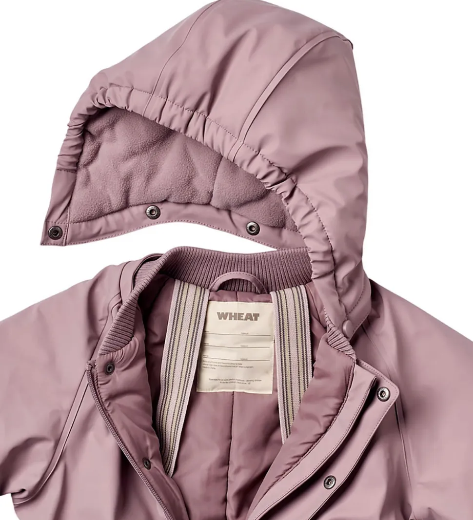 Wheat flyverdragten har lynlåsåbning med dobbelt vindstolpe, hvoraf den udvendige lukkes til med trykknapper. På fronten er der to tryknapslommer, og den har praktiske seler indvendigt. Flyverdragten har aftagelig hætte med trykknapper, og kan justeres med velcro på toppen. Der er ribkrave, som er behagelig for barnet at have tæt på huden.