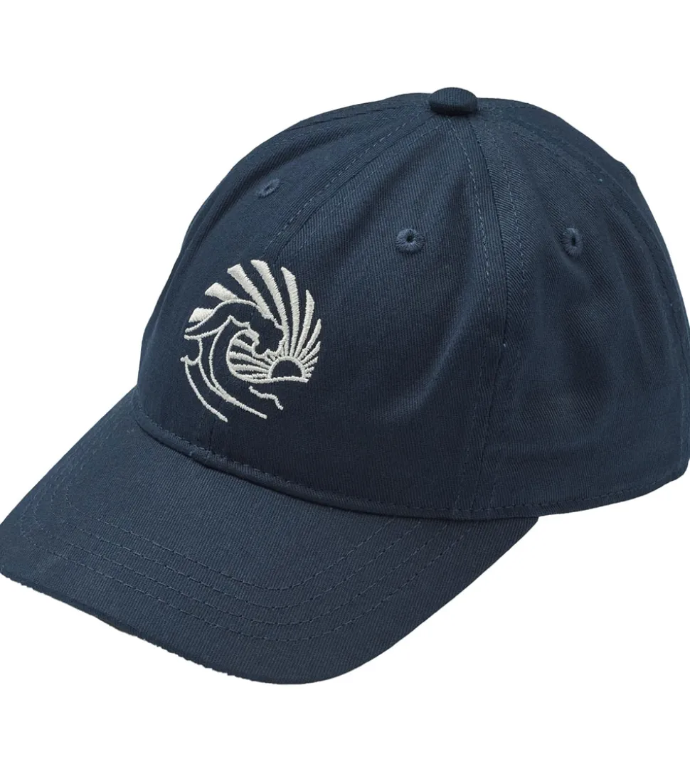 Stilfuld Wheat kasket i en dyb, marineblå nuance med et elegant, hvidt bølgeprint på fronten. Wheat kasketten har en klassisk, justerbar rem bagpå for optimal pasform og komfort.