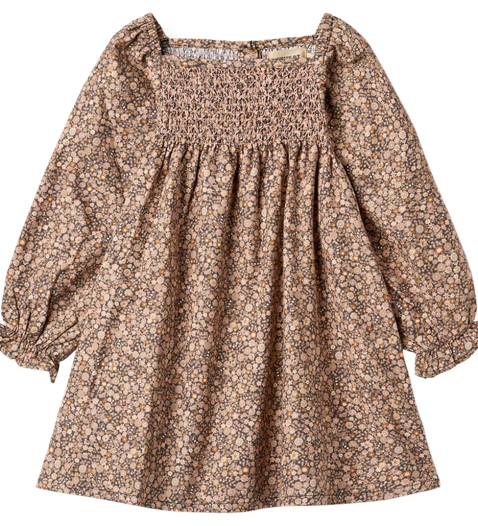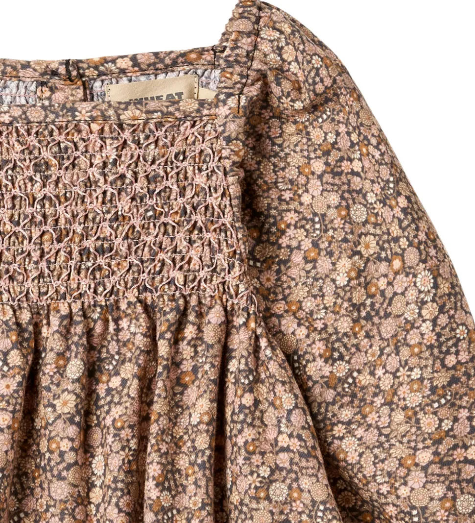Fin Wheat kjole med et skønt alloverblomsterprint i bløde, rosa og lilla nuancer på en let koksgrå baggrund. Wheat kjolen har lange ærmer og smock-detaljer på overdelen, som giver en flot struktur. Den firkantede halsudskæring og lette rynker ved ærmerne tilføjer et elegant udtryk.