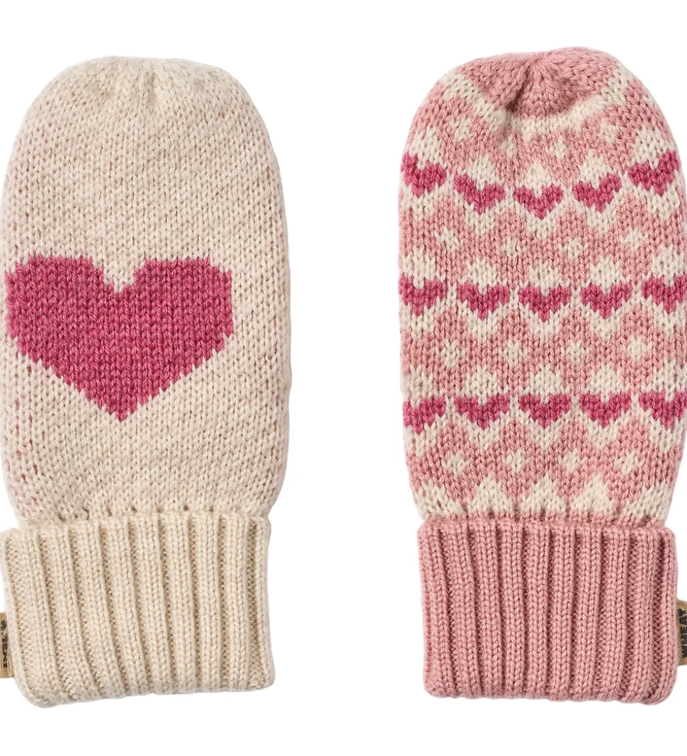 Skønne Wheat luffer strikket med en jacquardstruktur, hvor lufferne har hvert sit design. Den ene er beige med et hjerte, mens den anden har et hjertemønster over det hele i rosa og beige nuancer.