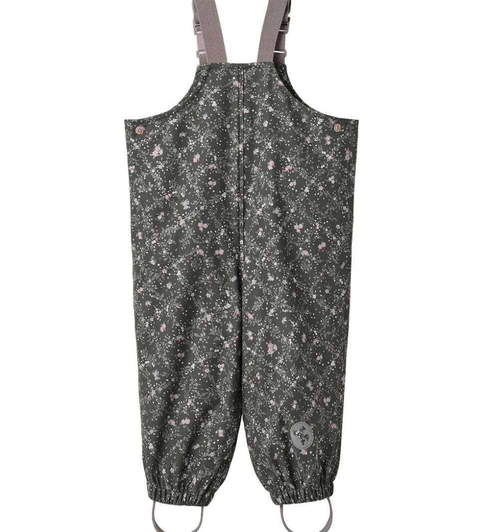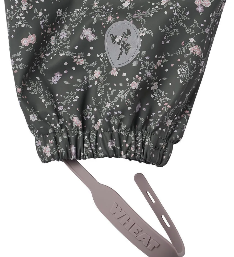 Flotte Wheat regnbukser af PU i mørk koksgrå med et småblomstret alloverprint i lilla, rosa og grønne nuancer.