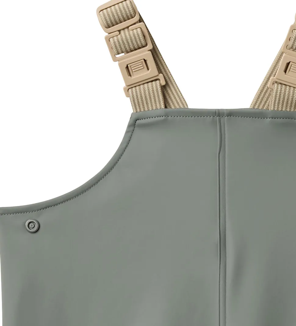 Wheat regnbukserne har elastiske seler, der kan justeres i længden, og de åbnes fortil med klikspænder. Regnbukserne kan strammes ind i siderne med en trykknap i hver side. Buksebenene har elastikkanter om anklerne, og der er aftagelige, justerbare gummistropper til at sætte under fodtøjet.