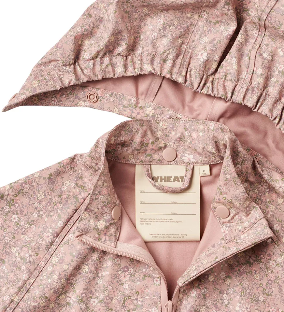 Wheat regnjakken har en aftagelig hætte, som sidder fast med trykknapper, og den kan justeres i toppen med velcro. Ærmerne har smalle elastikkanter, og i bunden har jakken elastikkant i siderne. Regnjakken åbnes med en lynlås med gummilukning og hagebeskytter, og i siderne er der praktiske, åbne lommer.