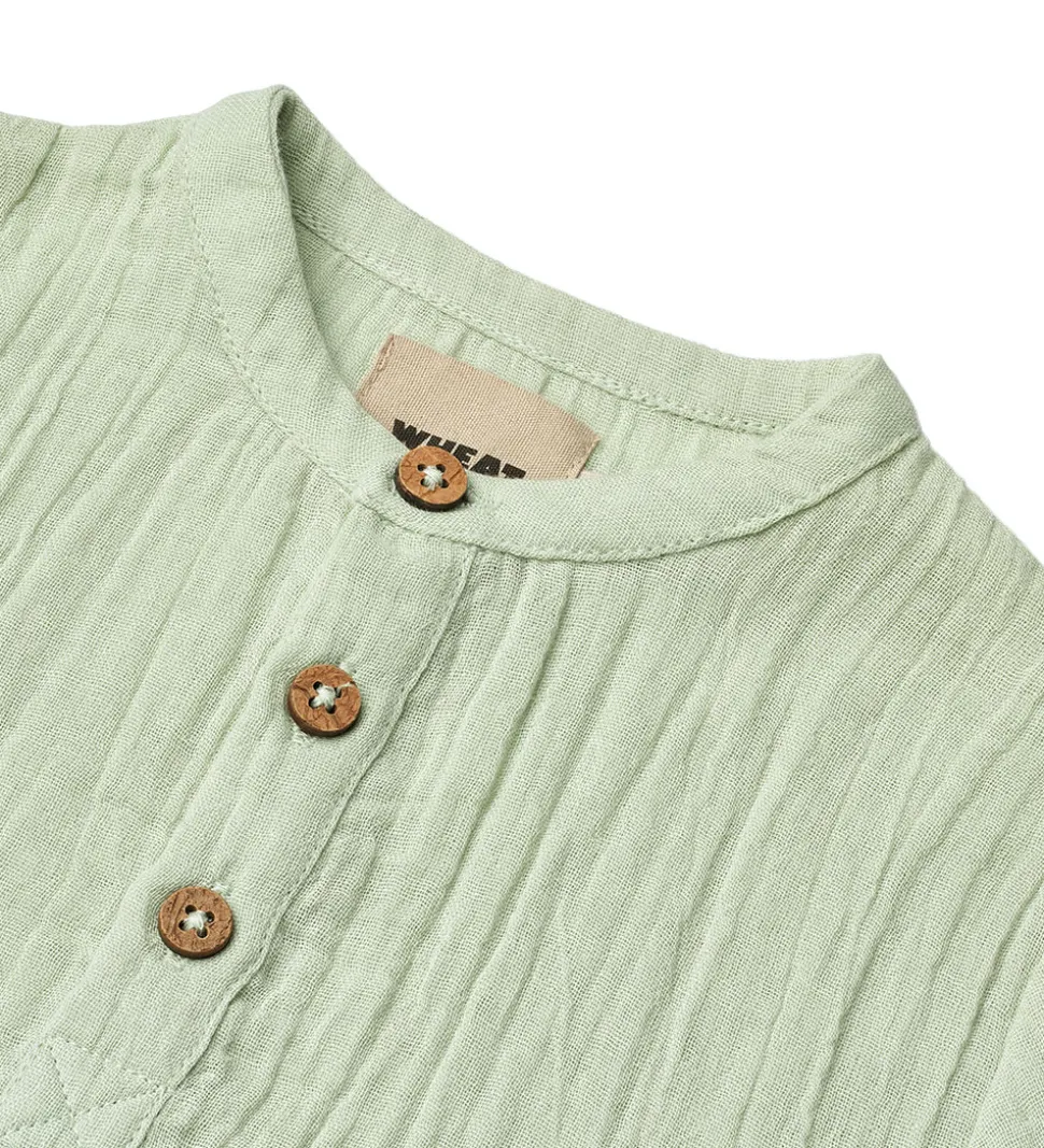 Flot Wheat skjorte i en lysegrøn nuance med musselin struktur. Wheat skjorten har korte ærmer og tre praktiske knapper på fronten. Designet kombinerer komfort og stil, perfekt til en tidløs garderobe.