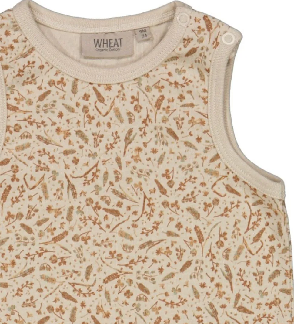 Wheat sommerdragten har brede skulderstropper og korte ben, og i alle åbninger er der smalle ribkanter. Dragten kan åbnes ved venstre skulder samt mellem benene med praktiske trykknapper.