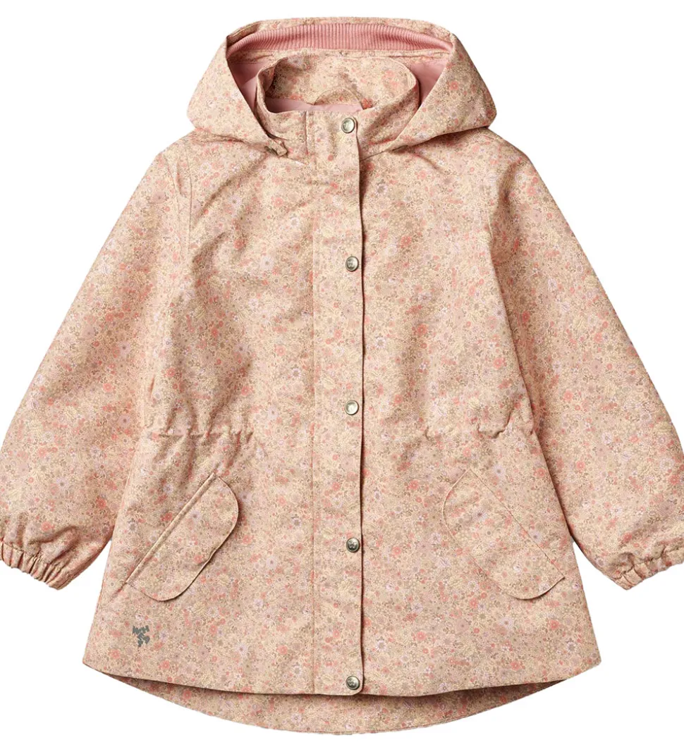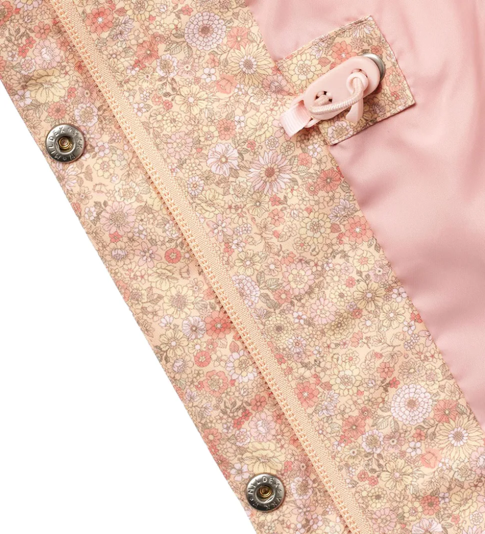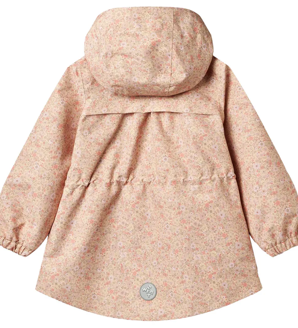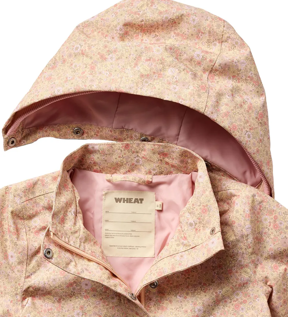 Wheat sommerjakken har en aftagelig hætte, som sidder fast med trykknapper. I toppen kan den justeres med velcro, og i ansigtsåbningen har den en bred ribkant. Ærmerne har elastikkanter. I taljen kan den strammes ind med en elastiksnøre på indersiden, så den får en flot, figursyet facon.