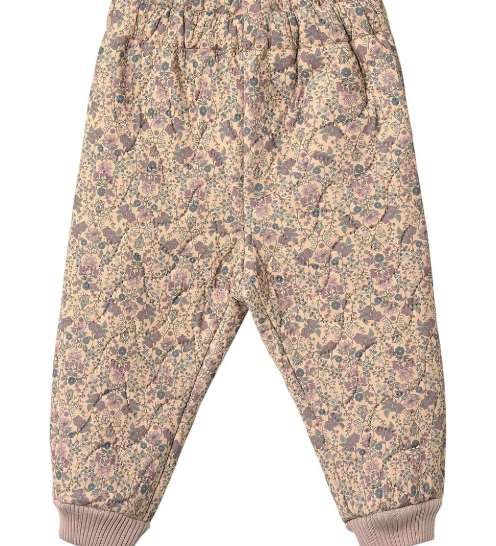 Fine Wheat termobukser i korngul med et farverigt alloverblomsterprint i afdæmpede nuancer samt ribkanter i støvet rosa. Termobukserne har en bølgende, quiltet struktur.