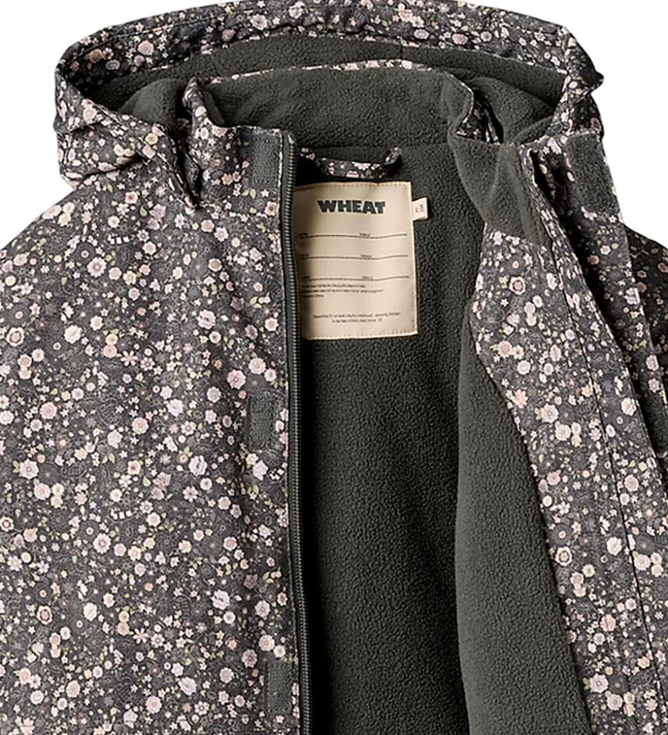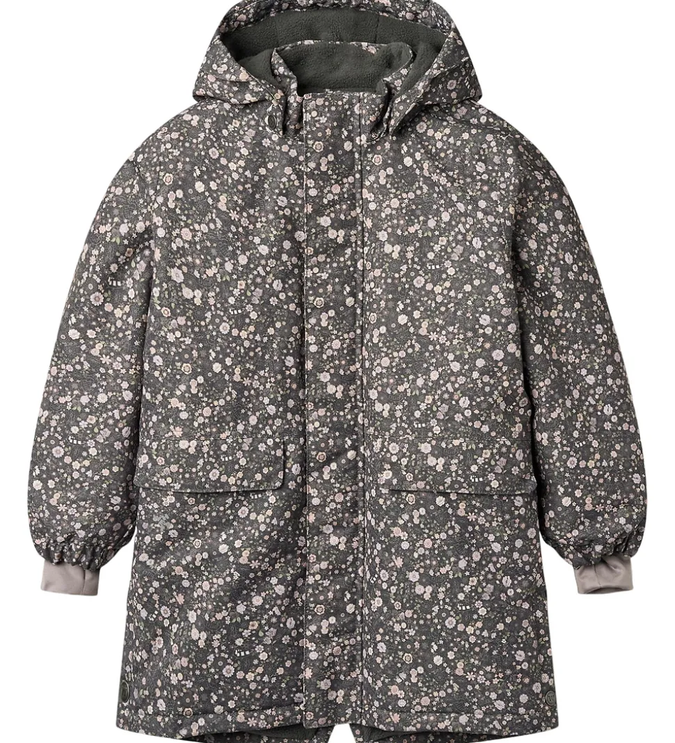Fin Wheat vinterjakke i mørk koksgrå med et alloverblomsterprint i støvede lilla, rosa og grønne nuancer og velplacerede reflekslogoer.