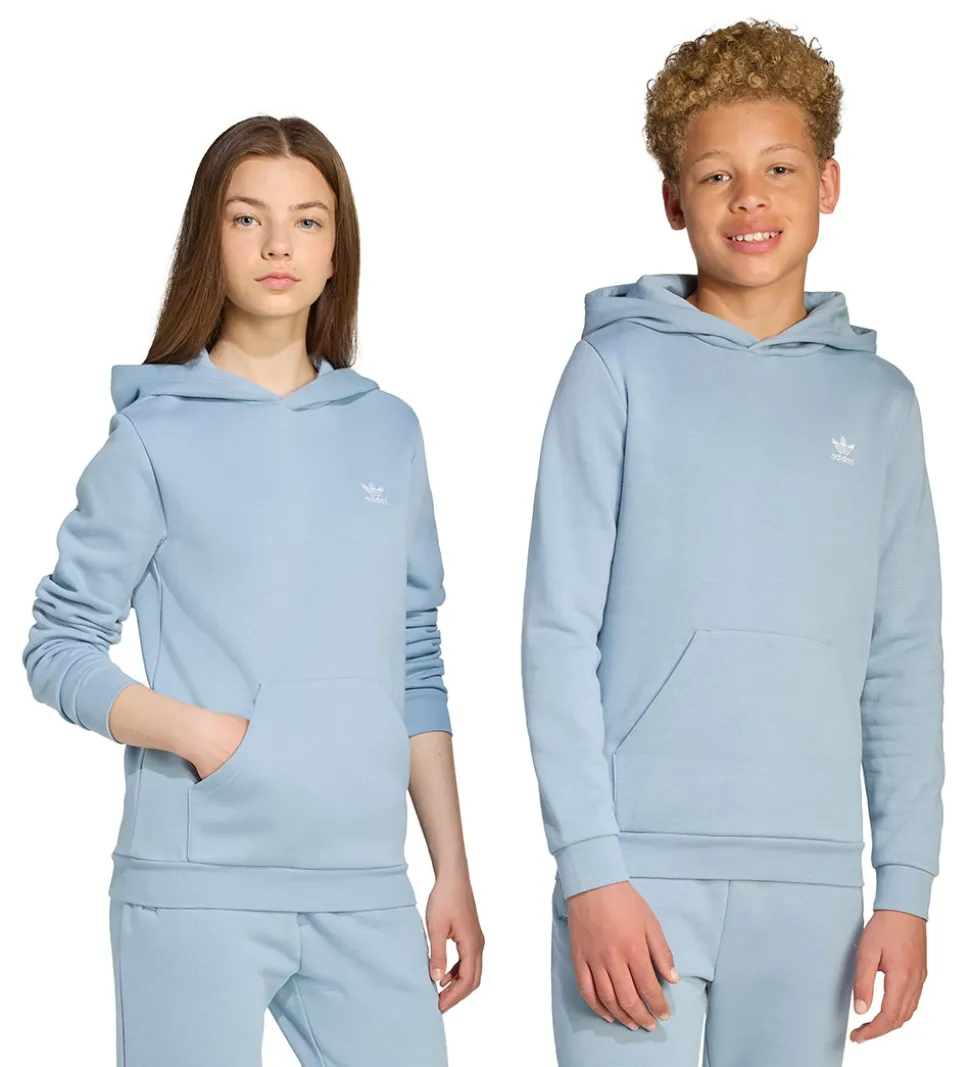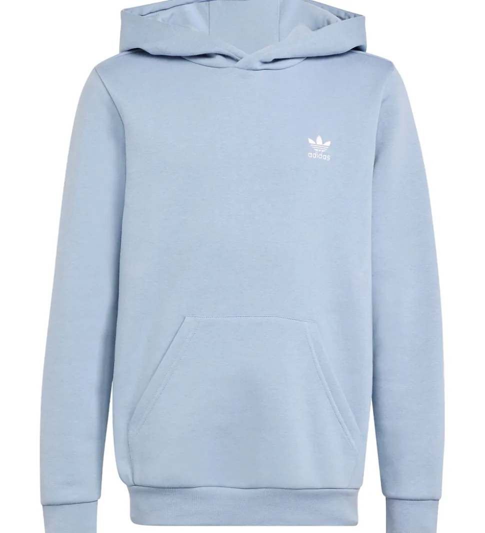 Flot adidas Originals hættetrøje i en lyseblå farve med et diskret, hvidt logoprint på brystet. Hættetrøjen har en rummelig kængurulomme på forsiden. adidas Originals hættetrøjen kommer med ribkanter i livet og ved håndleddene, hvilket giver et stilrent og moderne look.