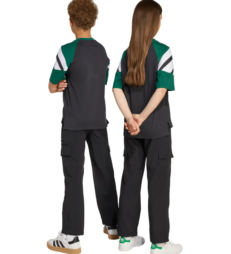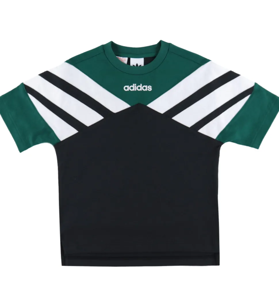 Stilfuld adidas Originals t-shirt med en iøjnefaldende designstruktur. T-shirten har en overdel i grøn, der elegant går ned i sort på forsiden. Den er dekoreret med tre hvide striber i et vinkelformet mønster på brystet. adidas Originals logoet er trykt centralt på forsiden i hvidt.