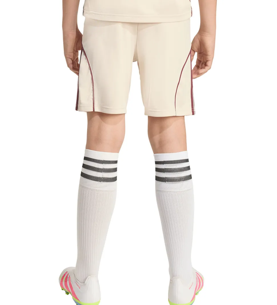Stilfulde adidas Performance shorts i lys beige farve med flotte kontraststriber i bordeaux langs siderne, og nederst på højre bukseben sidder der et logo fra den hollandske foboldklub Ajax Amsterdam. Shortsene er inspireret af holdets 3. sæt.
