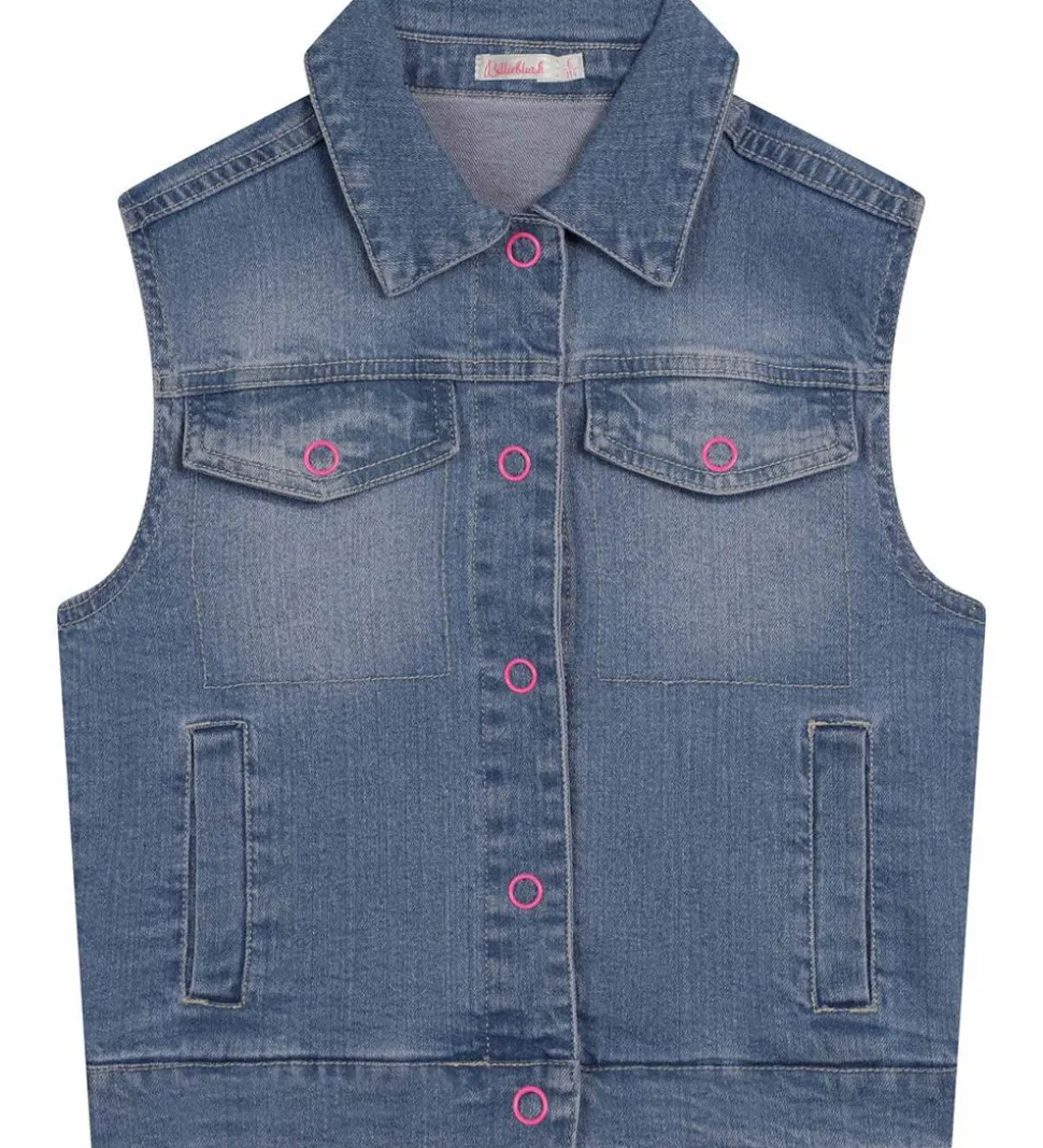 Billieblush denimvesten har en klassisk, ombukket krave og smalle kanter i ærmegabene. Livåbningen har en elastikkant bagtil. Denimvesten åbnes ved hjælp af gennemgående trykknapper, og på fronten er der store klaplommer på brystet, som også lukkes med trykknapper. I siderne er der to åbne forlommer.