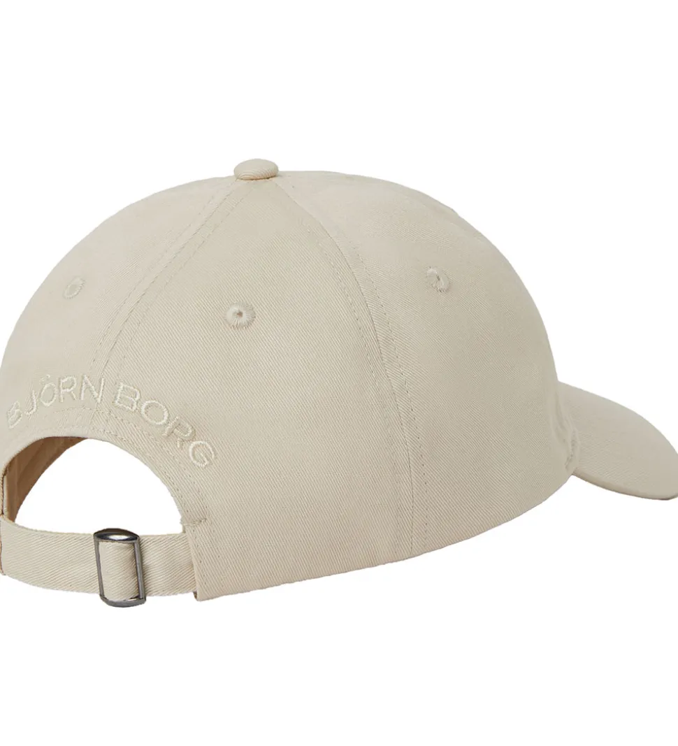 Flot Björn Borg kasket i beige, og fortil til venstre står der “Borg” med småt, broderede bogstaver i beige. Logoet “Björn Borg” er også broderet i beige bagpå kasketten, lige over spænden.