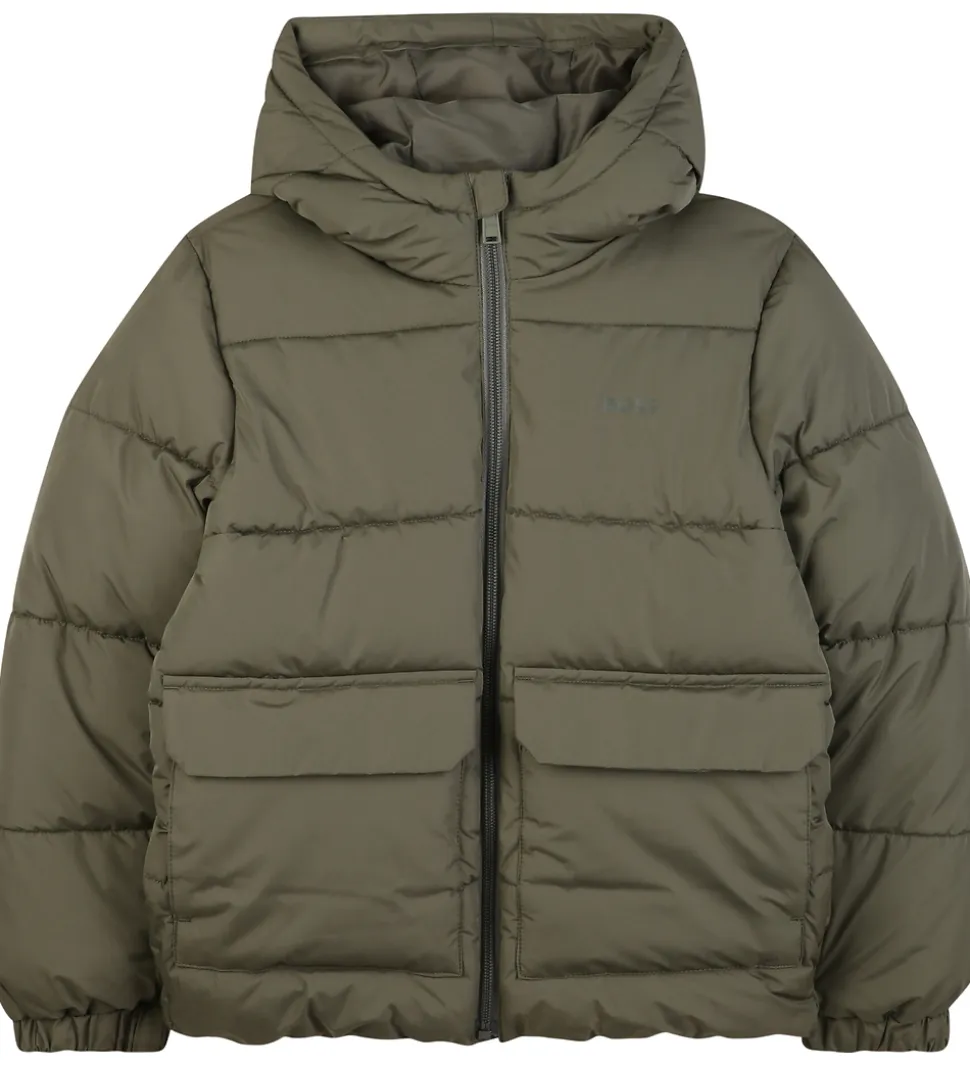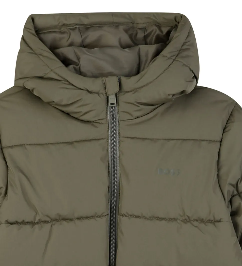BOSS dynejakken har en fast hætte, og ærmerne har brede elastikkanter. I bunden har dynejakken en indvendig elastikkkant. Dynejakken lukkes med en lynlås med hagebeskytter og indvendig vindstolpe, og fortil sidder der to store klaplommer, som lukkes med en skjult trykknap. Dynejakken har et glatvævet for, og den har en lun og letvægtig polyestervattering med Thermolite EcoMade. Dynejakken har fået en vandafvisende behandling, så vand ikke så let trænger igennem.