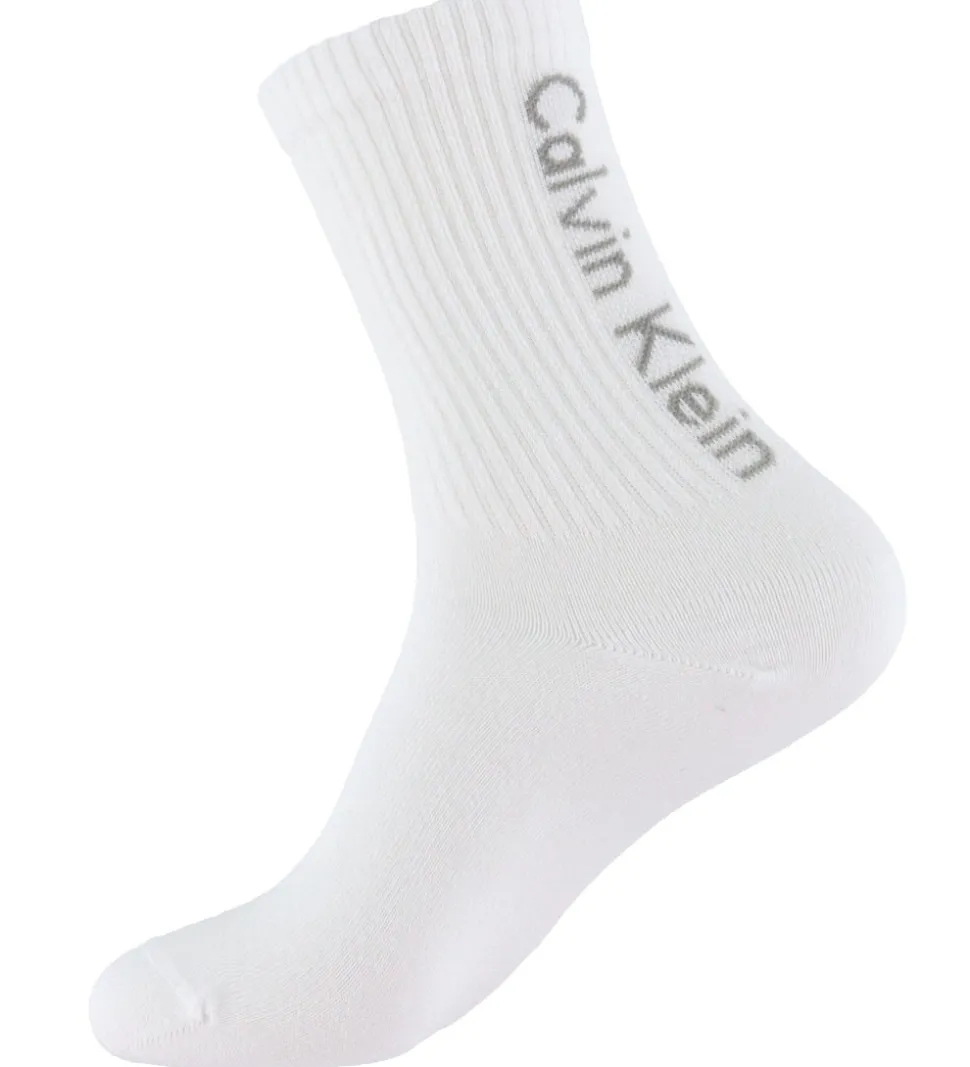 Fine Calvin Klein strømper solgt i en 2-pak i hvid, og ned ad bagsiden af skaftet står der “Calvin Klein” i grå. Calvin Klein strømperne har et skaft med ribtruktur, og det ene par er lavet af lækkert viskose, mens det andet er lavet af blødt bomuld.