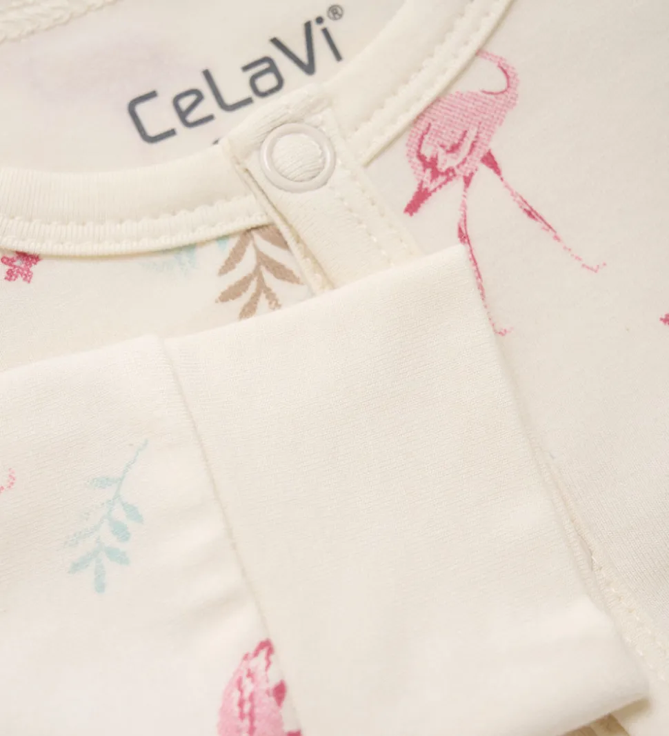 Skøn CeLaVi heldragt i cremehvid med et alloverprint af søde flamingoer og palmeblade i rosa, brune og grønne nuancer.