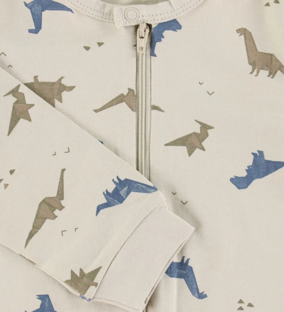 Sød CeLaVi natdragt i beige med print af dinosaurer i armygrøn og mørkeblå. Natdragten har en rund halsudskæring med en trykknap fortil. Den har lange ærmer og ben, og lukkes fortil med en lynlås med to skydere. Natdragten har mulighed for ombuk til lukkede hænder og fødder.