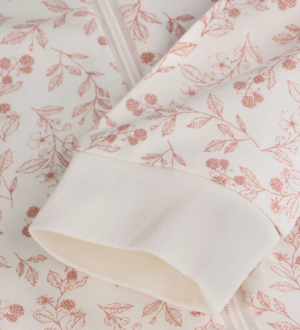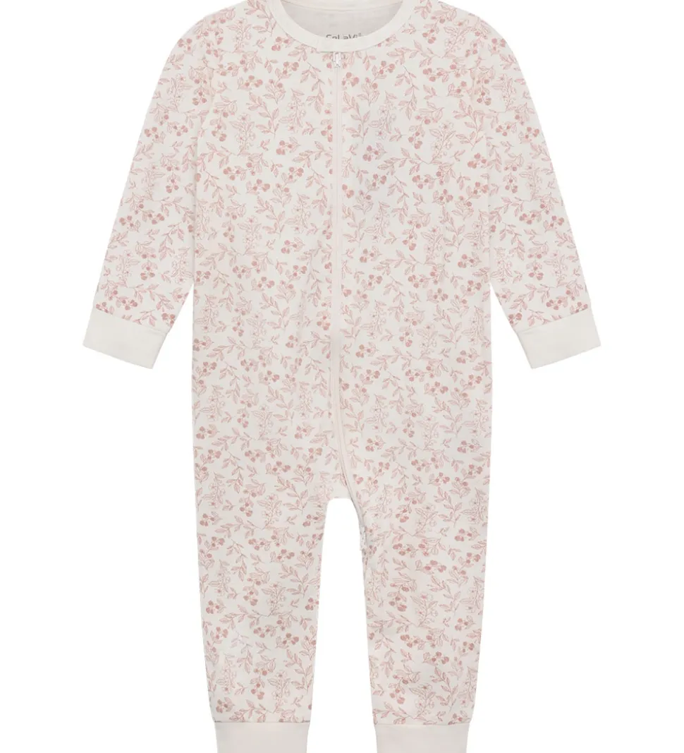 Fin CeLaVi natdragt i hvid med print af bær, blomster og blade i rosa. Natdragten har en rund halsudskæring med en trykknap fortil. Den har lange ærmer og ben, og lukkes fortil med en lynlås med to skydere. Natdragten har mulighed for ombuk til lukkede hænder og fødder.