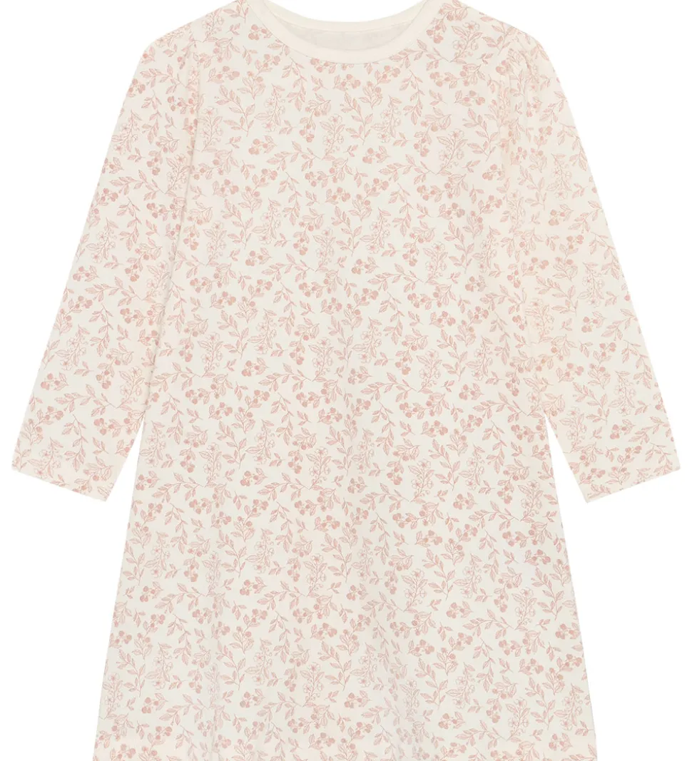 Elegant CeLaVi natkjole i hvid med et fint print af bær, blomster og blade i en rosa nuance. Natkjolen har en rund halsudskæring og lange ærmer med rynker ved skuldrene, som giver en flot effekt.