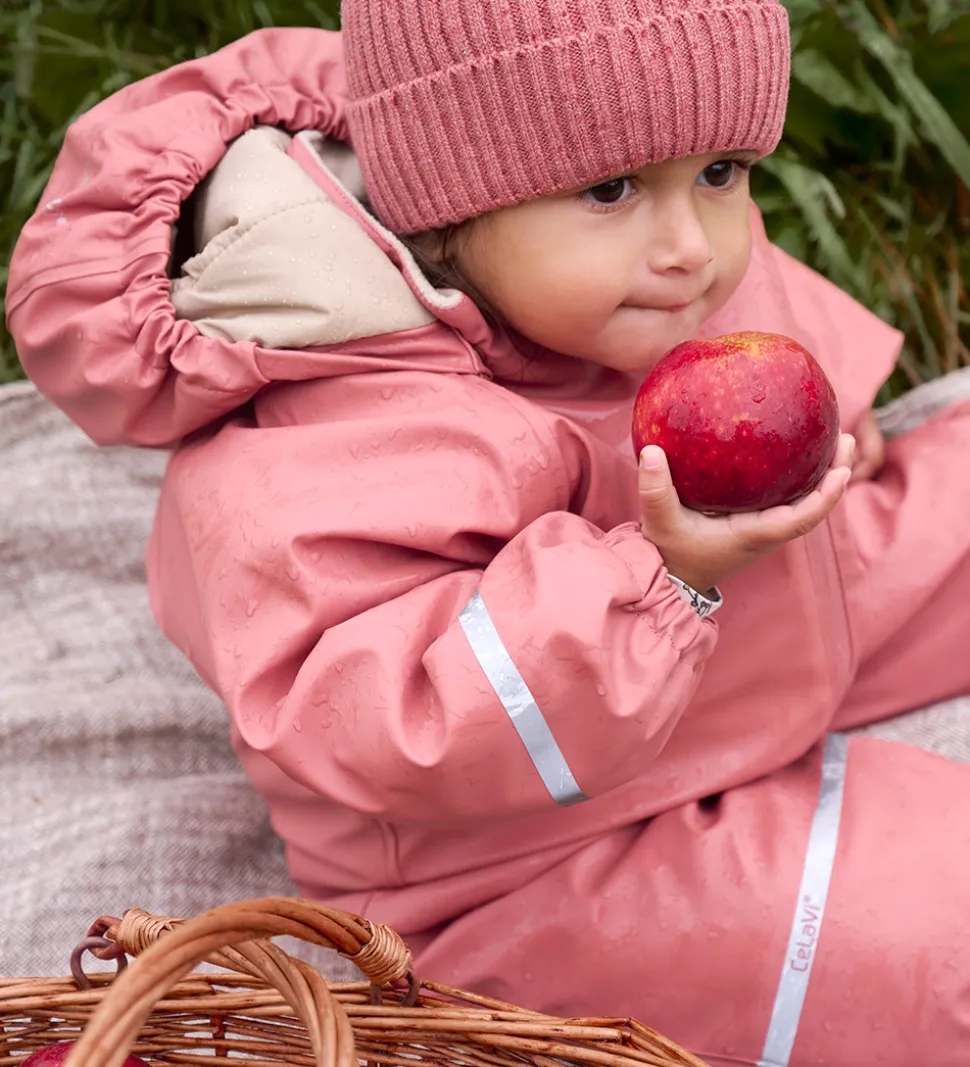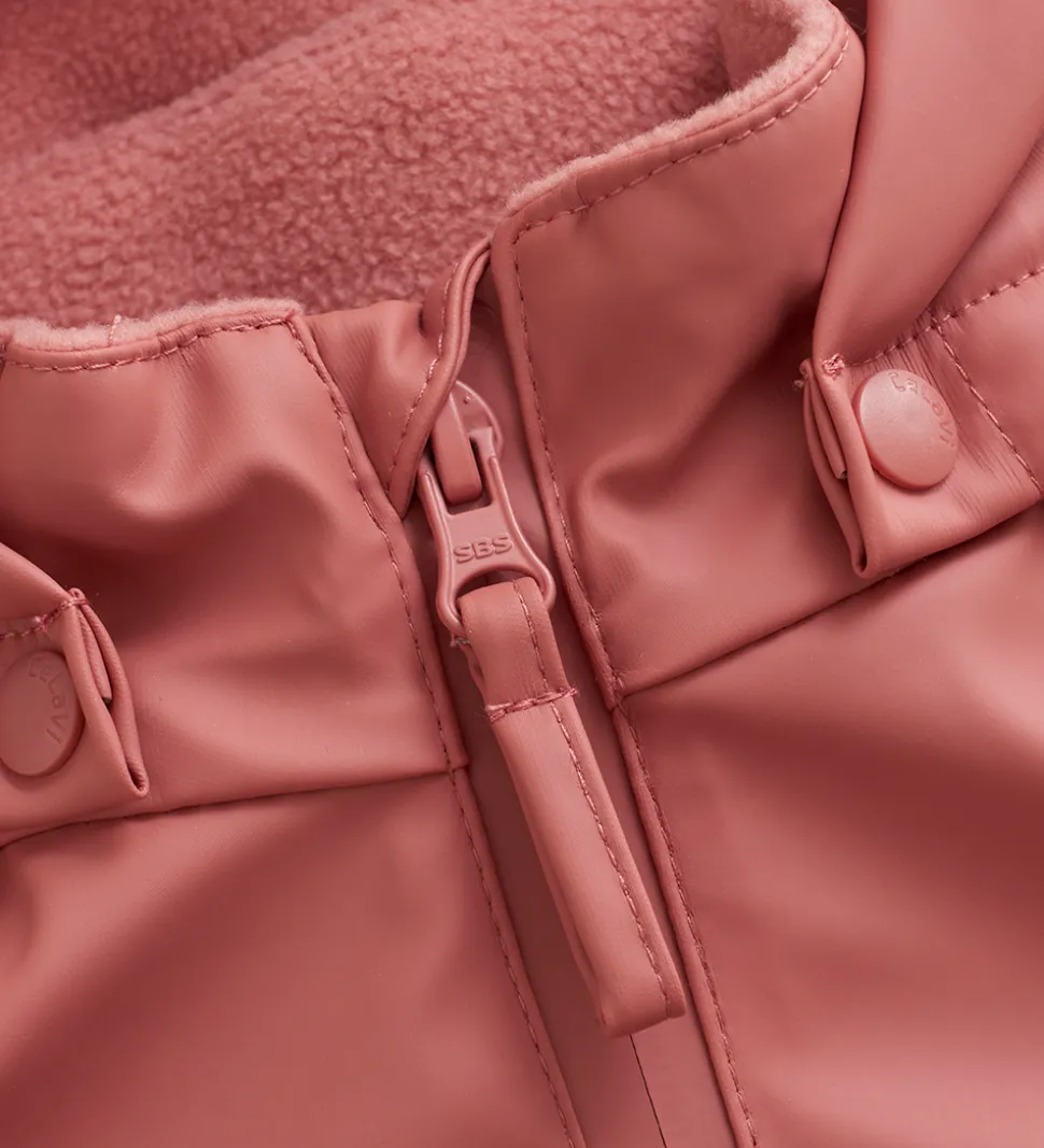 CeLaVi regndragten åbnes fortil med lynlås med hagebeskytter og indvendig vindstolpe. Indvendigt er der blødt fleecefor.