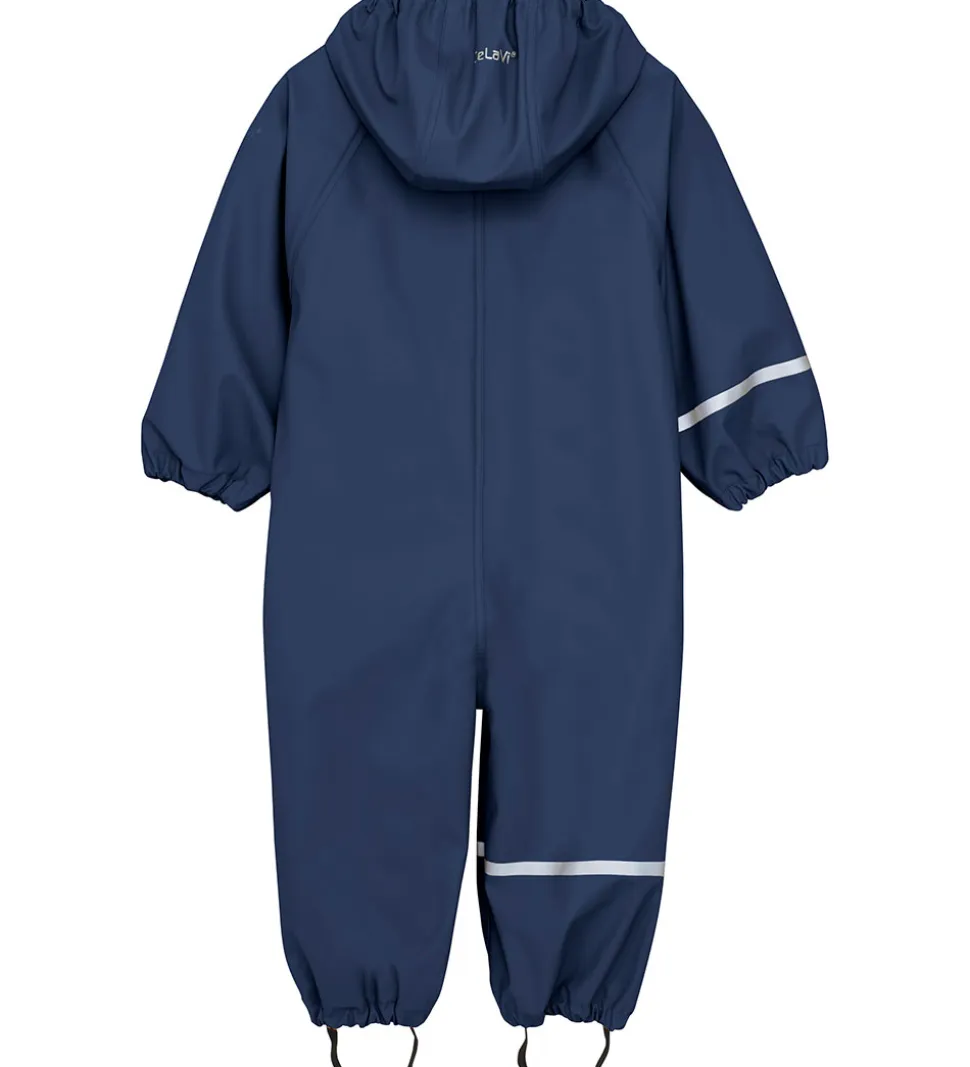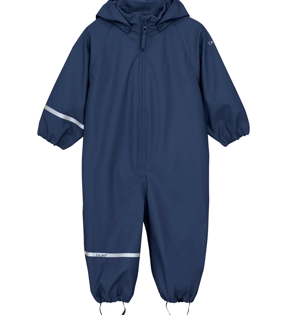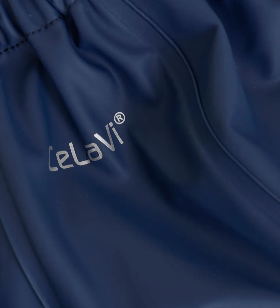 CeLaVi regndragten har en aftagelig hætte, som sidder fast med trykknapper. Ærmerne og buksebenene har elastikkanter, og der er justerbare elastikstropper til at sætte under fodtøjet. Kraven er foret med blødt fleece.