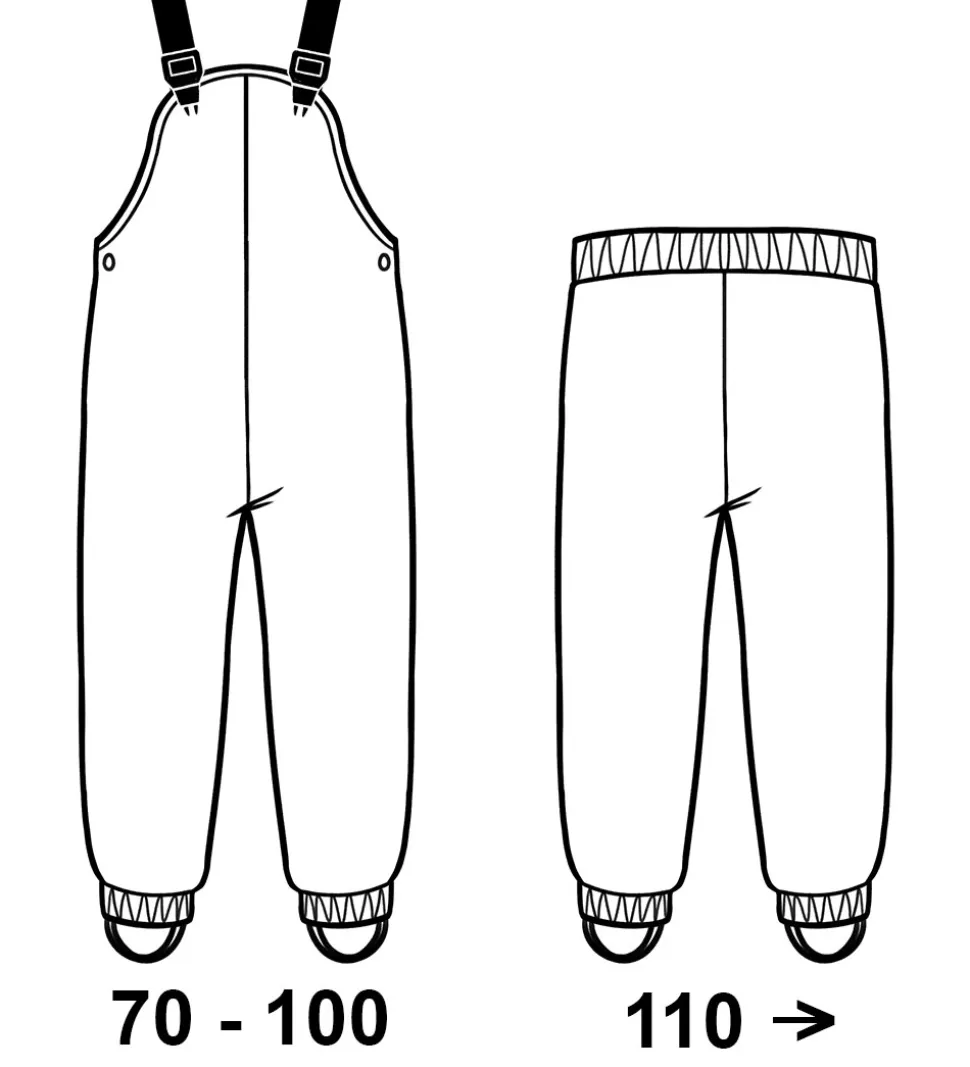 Regnbukserne har justerbare elastikseler, som kan åbnes fortil med klikspænder. Bukserne kan strammes ind i siderne med en trykknap. Regnbukserne har elastikkanter omkring benåbningerne og justerbare, aftagelige elastikstropper til at sætte under gummistøvlerne.