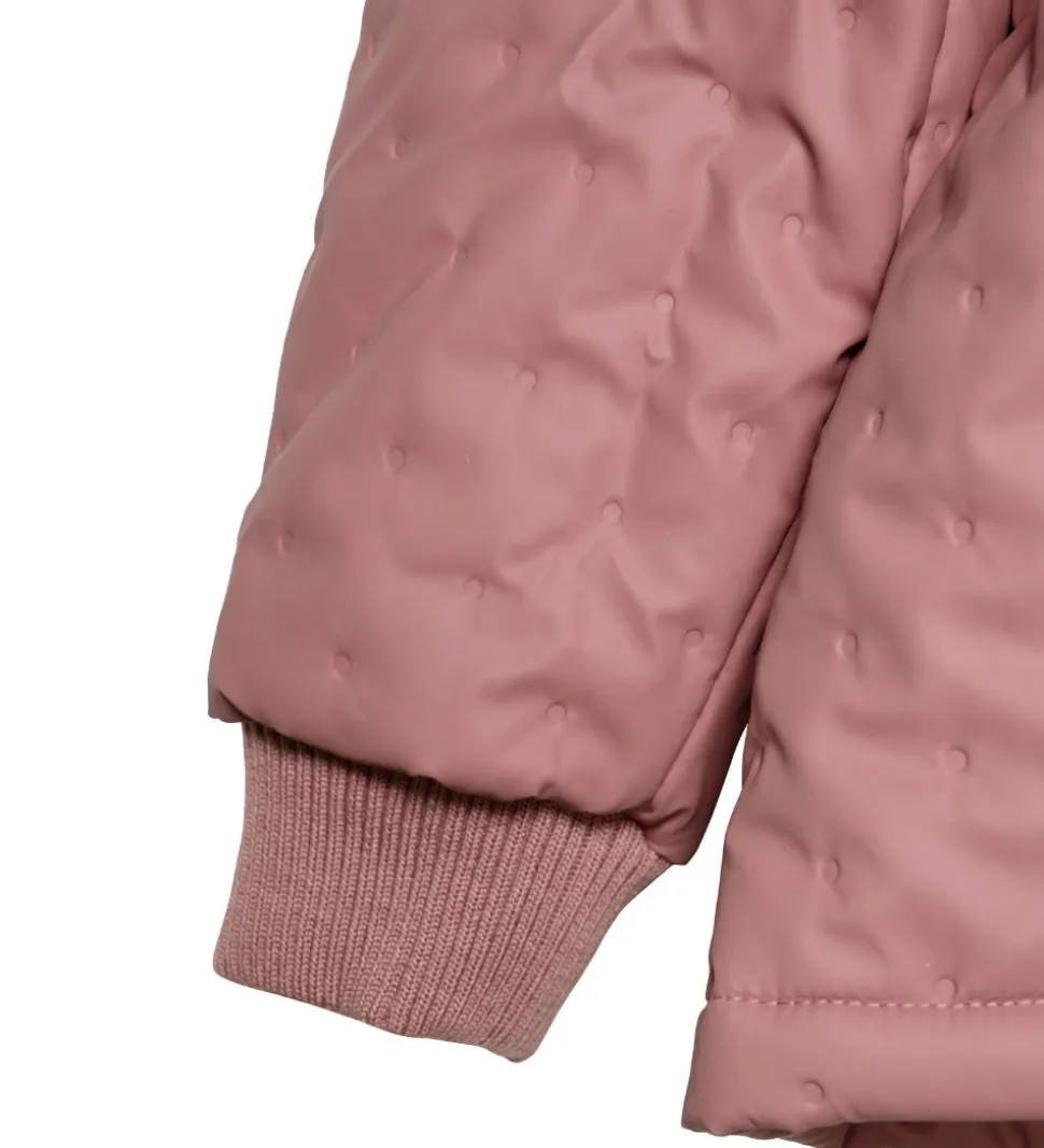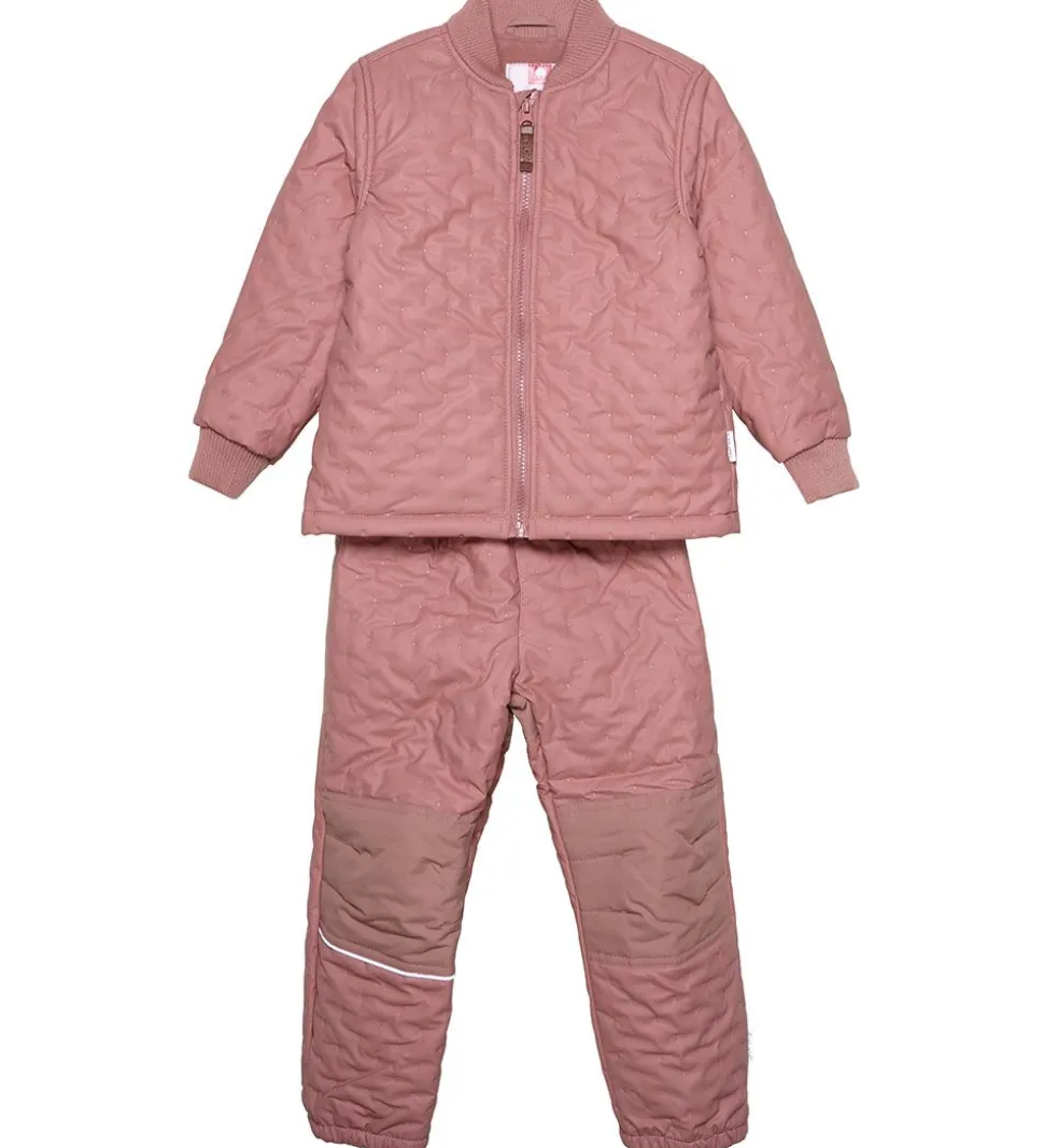 Lækkert CeLaVi termotøj i rosa med et indpræget prikmønster, der giver det en quiltet struktur. Sættet består af en termojakke og et par termobukser med en praktisk PU-coating og fleeceforing.