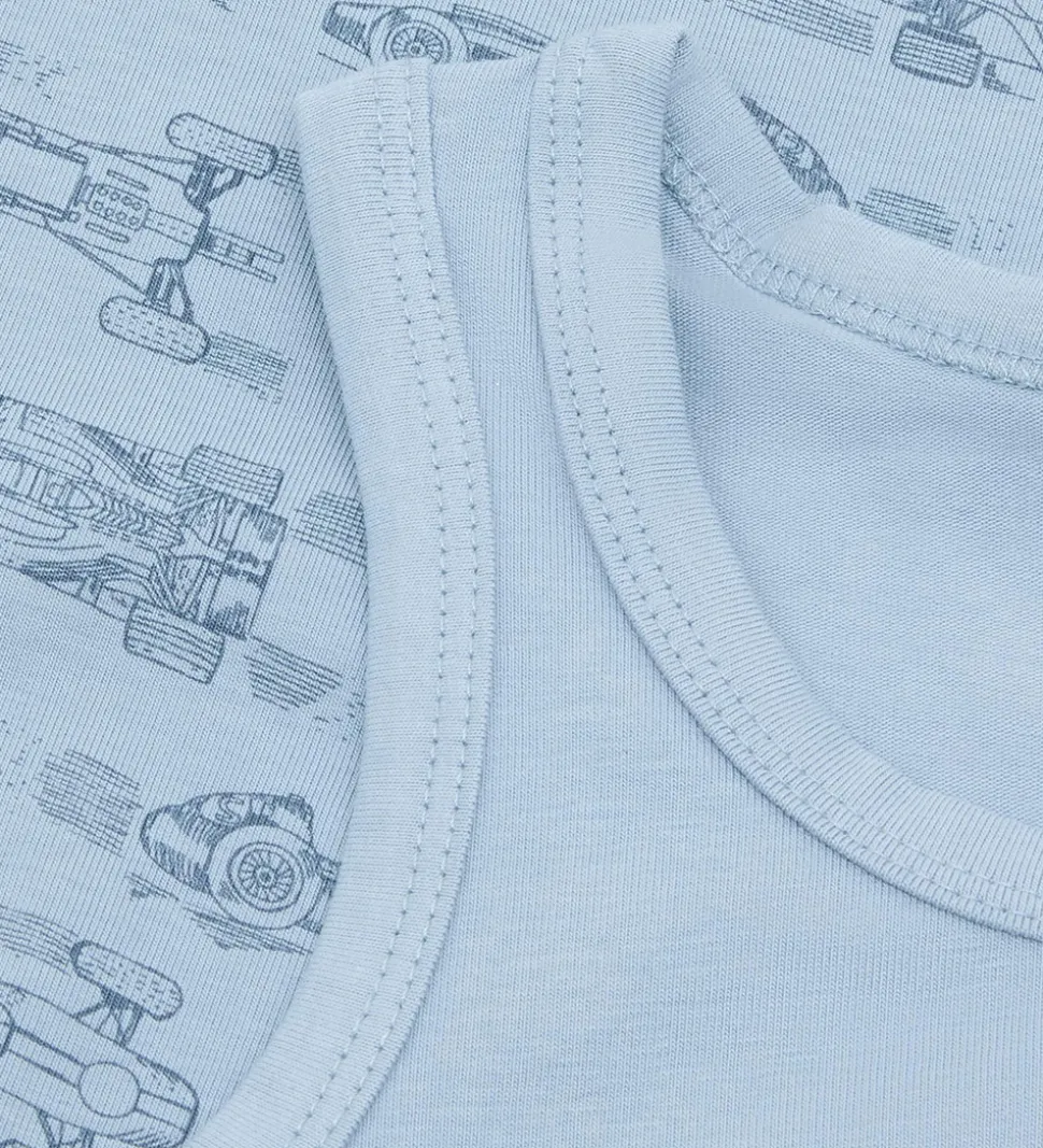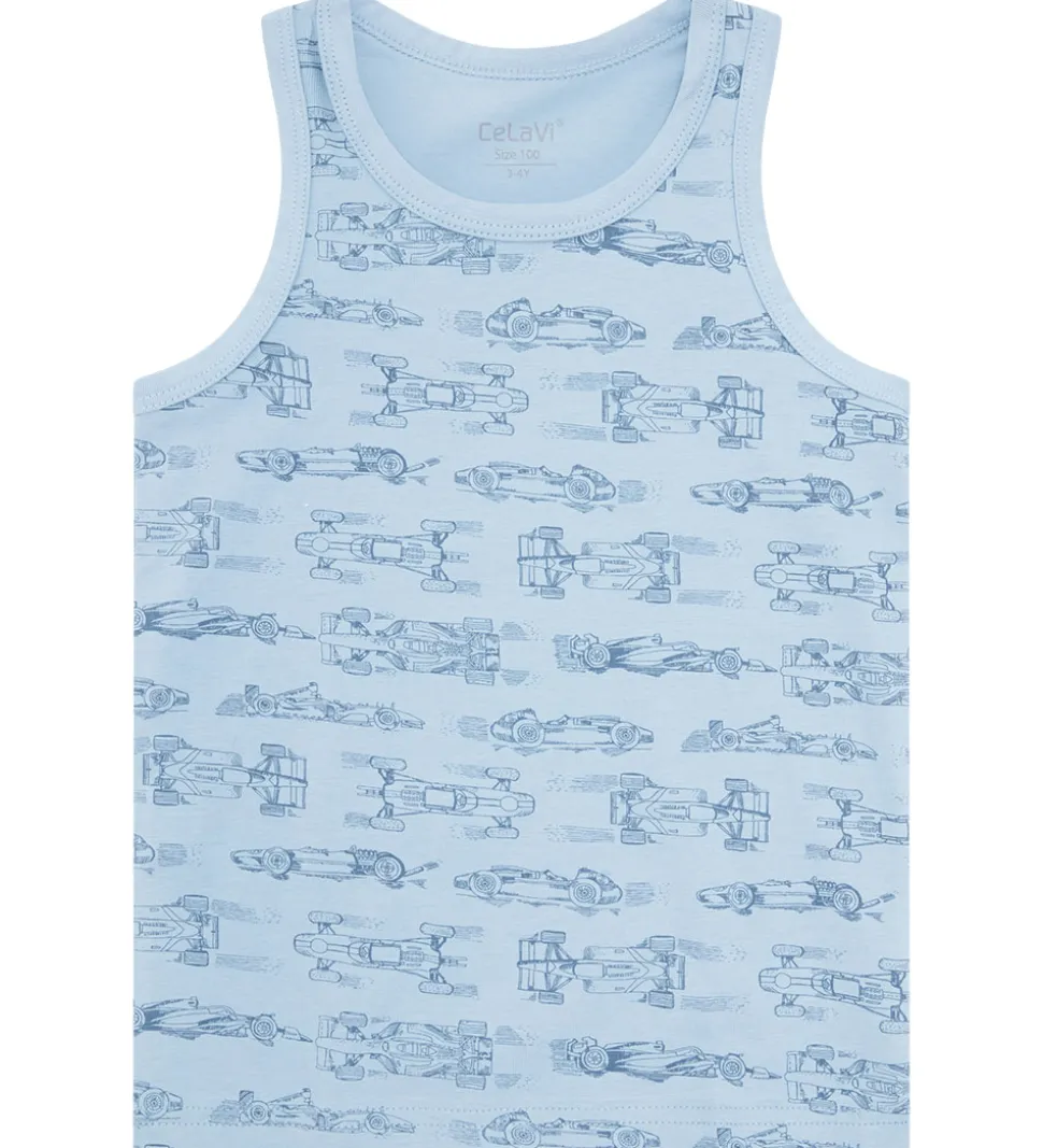 Lækre CeLaVi undertrøjer solgt i en 2-pak. Den ene undertrøje er ensfarvet lyseblå, mens den anden er lyseblå med et alloverprint af racerbiler i mørkeblå. Undertrøjerne har brede skulderstropper og rund halsudskæring.