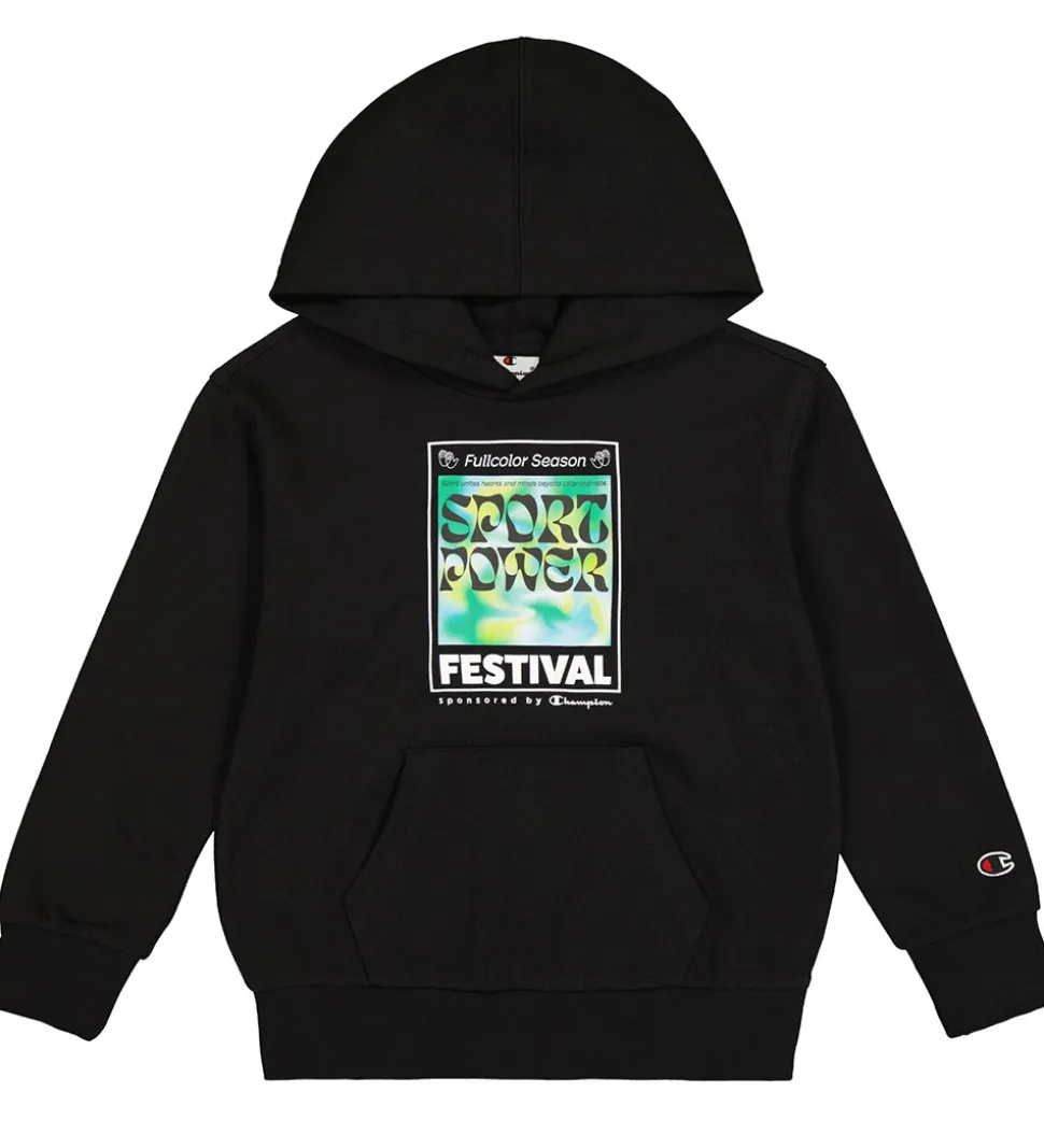 Stilfuld Champion hættetrøje i sort med farverigt print på fronten. Hættetrøjen har lange ærmer og en praktisk kængurulomme på maven, hvilket gør den til et komfortabelt valg til hverdag.