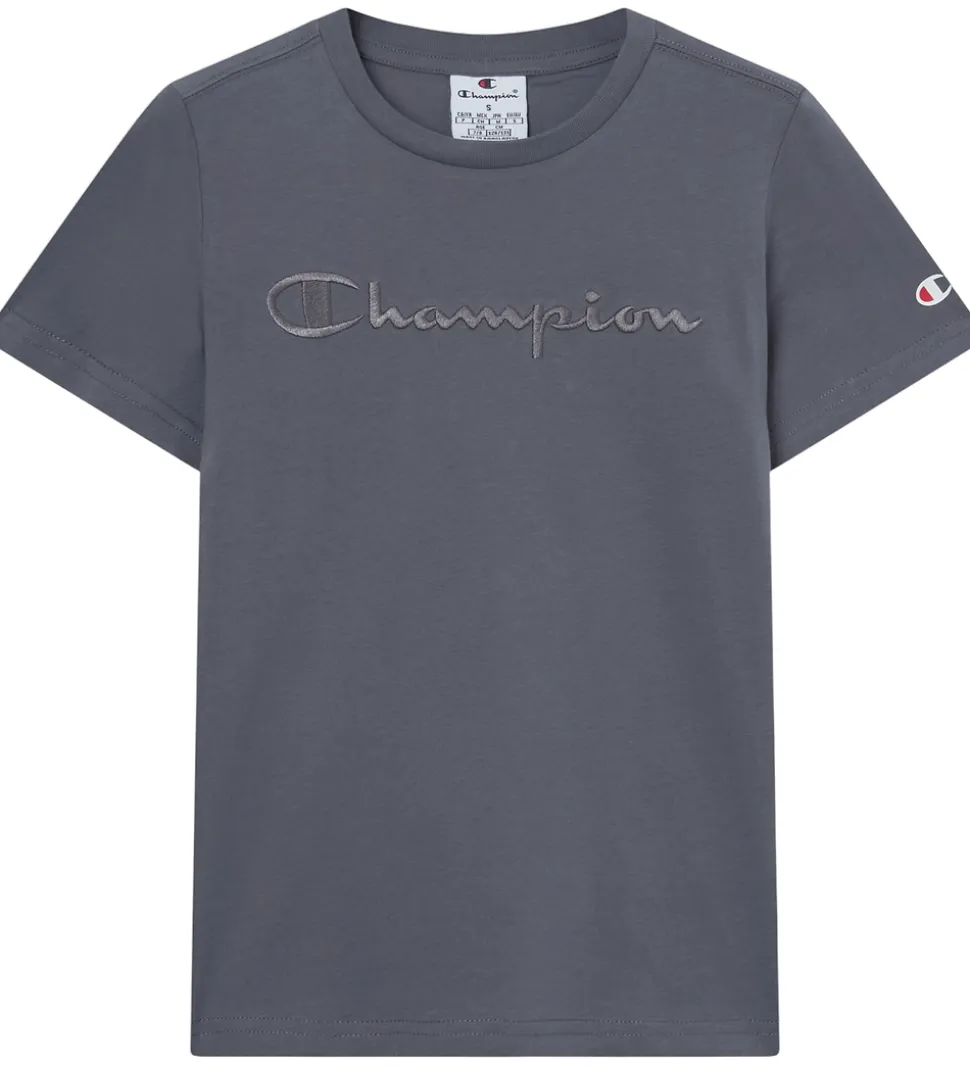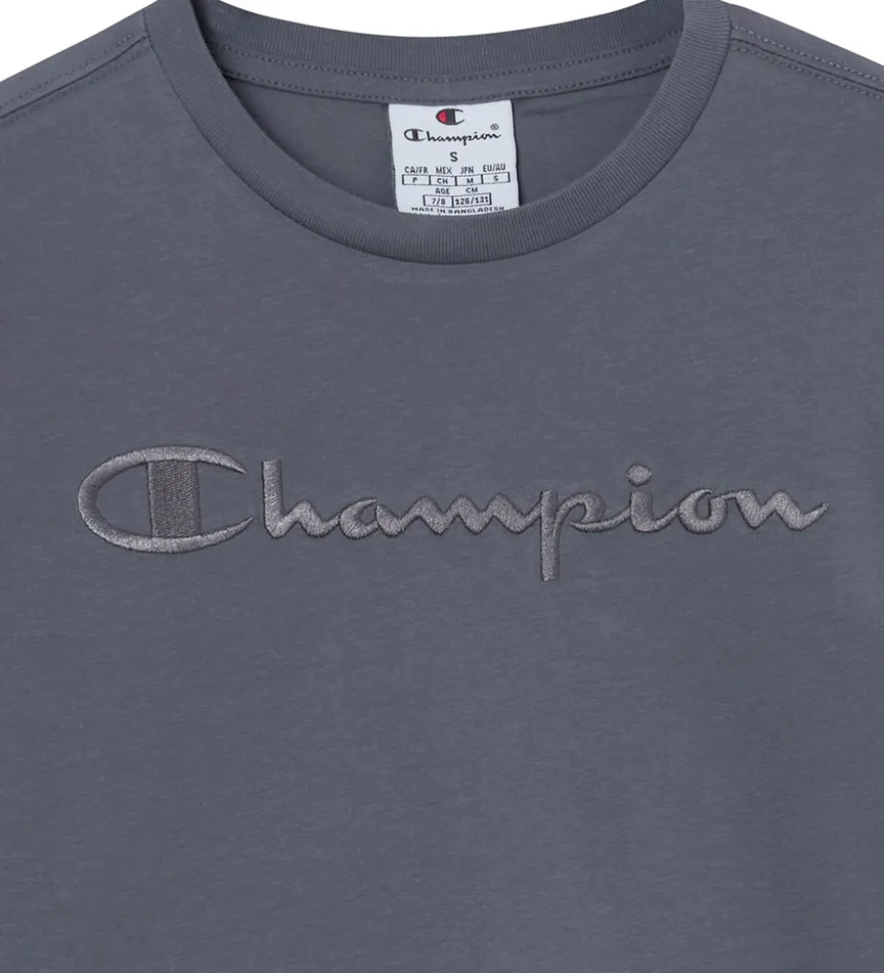 Smart Champion t-shirt i mørkegrå med et stort, broderet logo på brystet i samme farve som t-shirten. Champion t-shirten har en rund halsudskæring med en smal ribkant og korte ærmer.