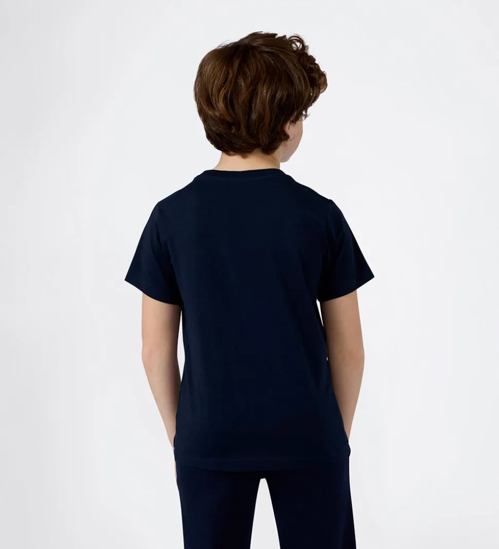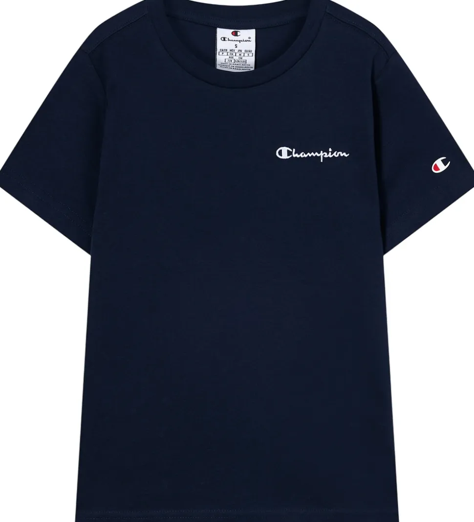 Flot Champion t-shirt i navyblå med et broderet logo i hvid på venstre bryst. Champion t-shirten har en rund halsudskæring med en smal ribkant og korte ærmer.