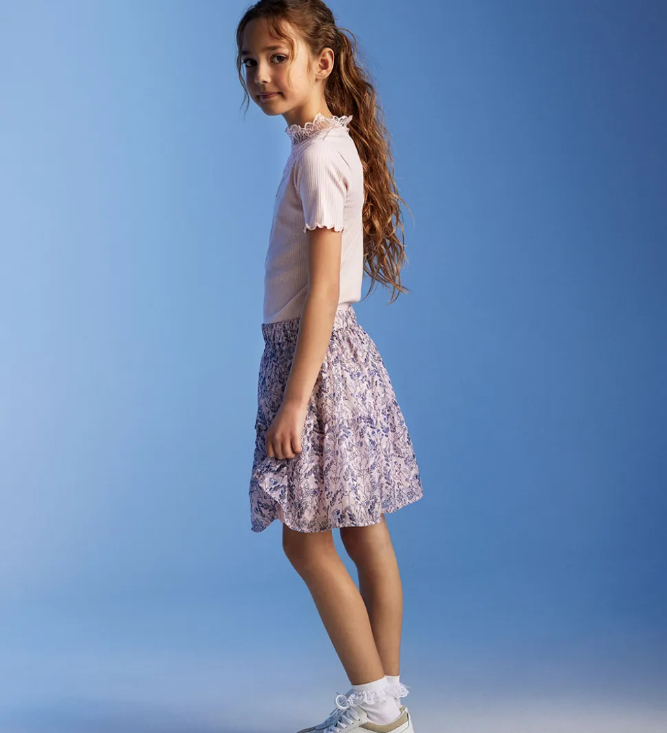 Sød Creamie nederdel med et fint alloverblomsterprint i lilla og rosa nuancer, der tilføjer et charmerende touch.