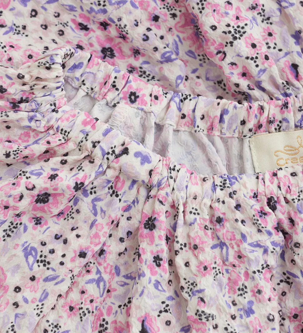 Charmerende Creamie top med korte pufærmer i en lys baggrund prydet med små blomsterprint i rosa og lilla nuancer. T-shirten har en elastisk detalje i taljen, der giver en feminin silhuet.
