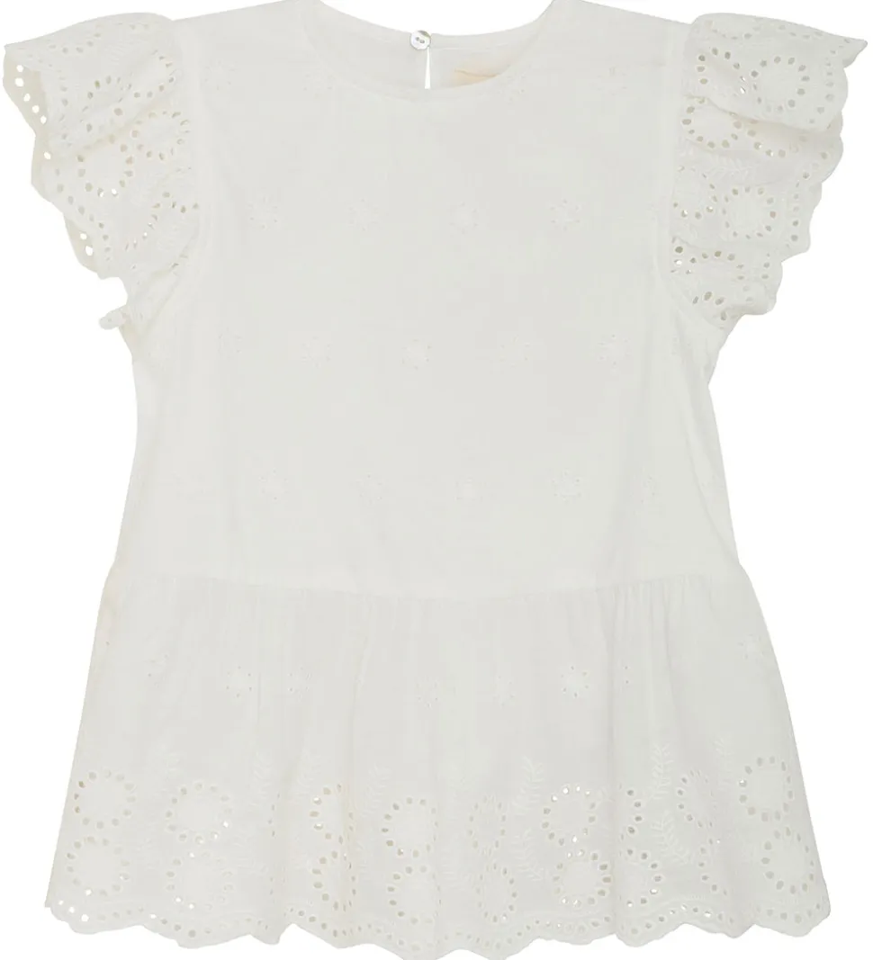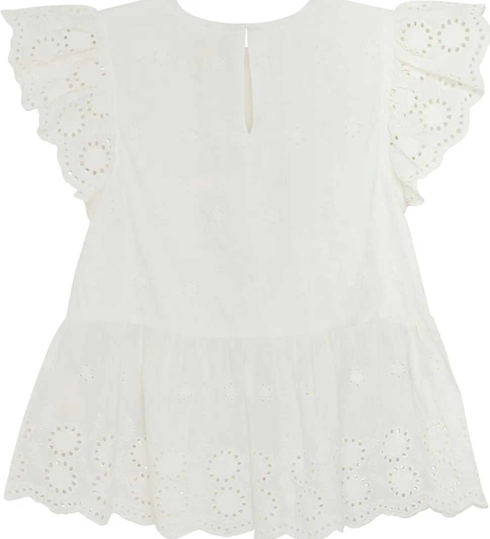 Skøn top fra Creamie i hvid med diskrete, broderede blomster og fint hulmønster. Den har en rund halsudskæring med en knap i nakken og korte flæseærmer. Toppen er skåret i taljen, som giver den nederst del god vidde og et feminint udtryk.