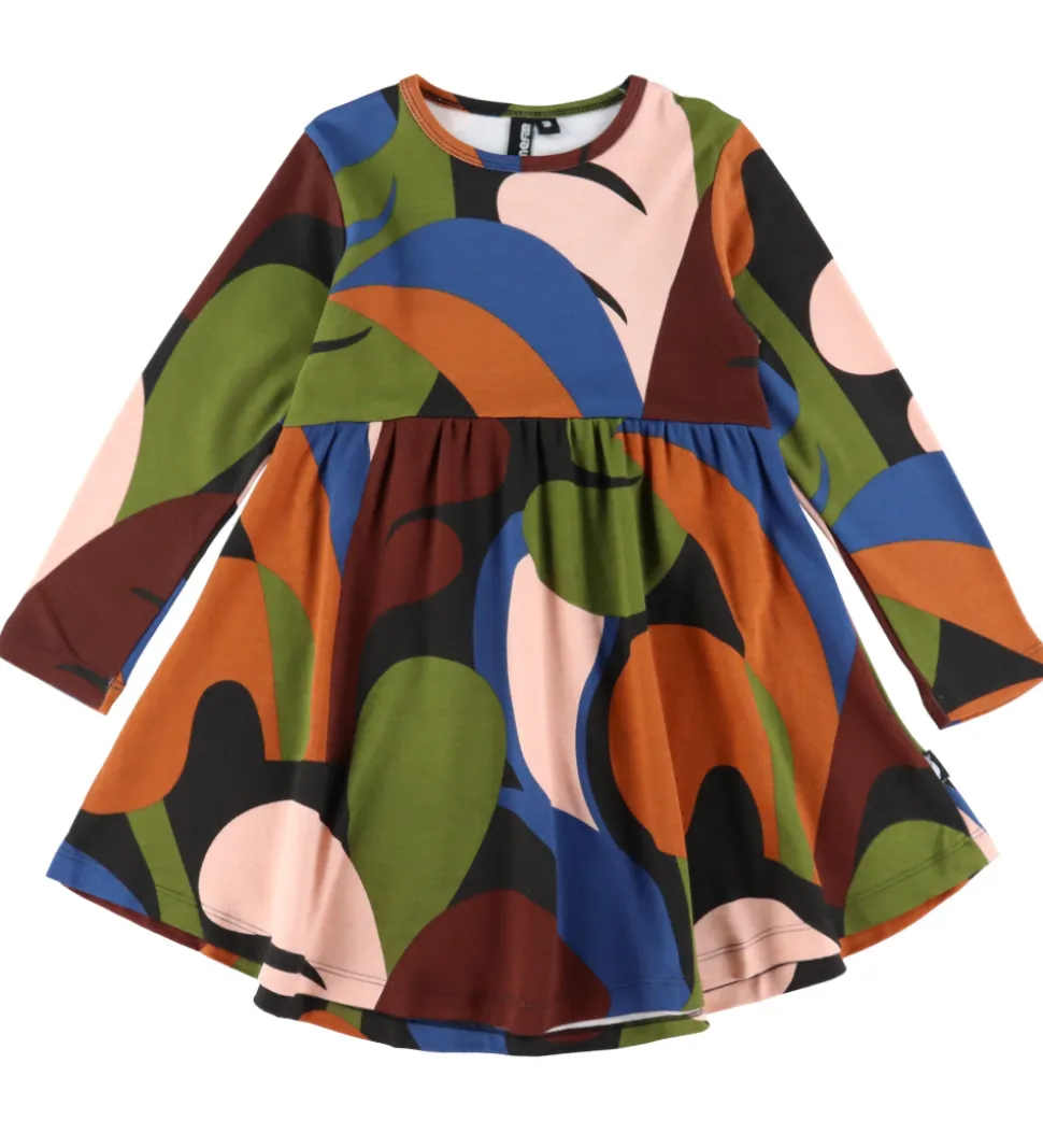 Farverig Danefæ kjole med et abstrakt mønster. Kjolen har en rund halsudskæring og lange ærmer. Den er skåret i taljen, hvor skørtet får god vidde.