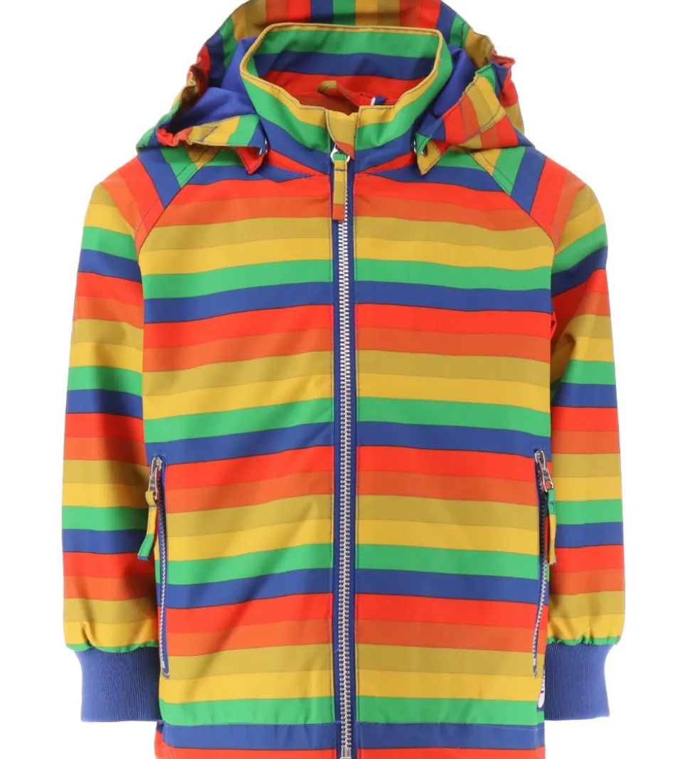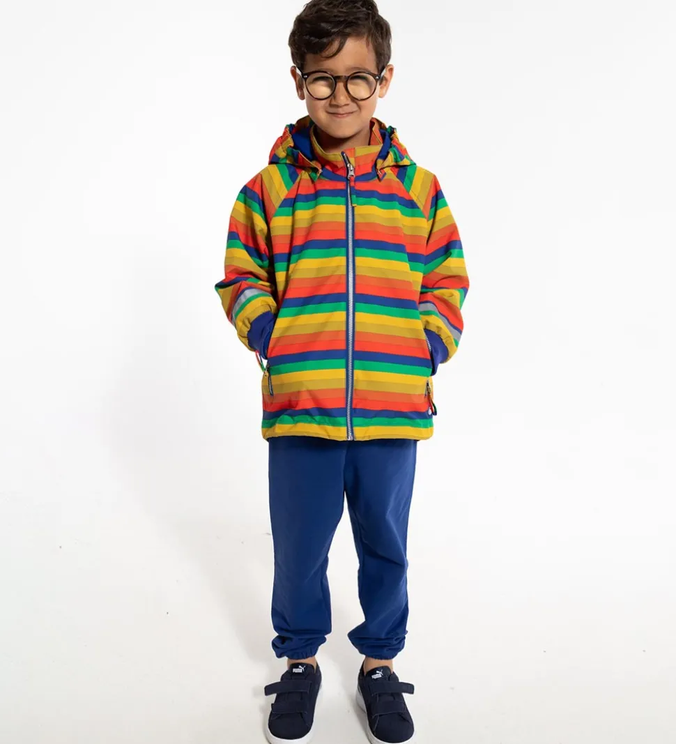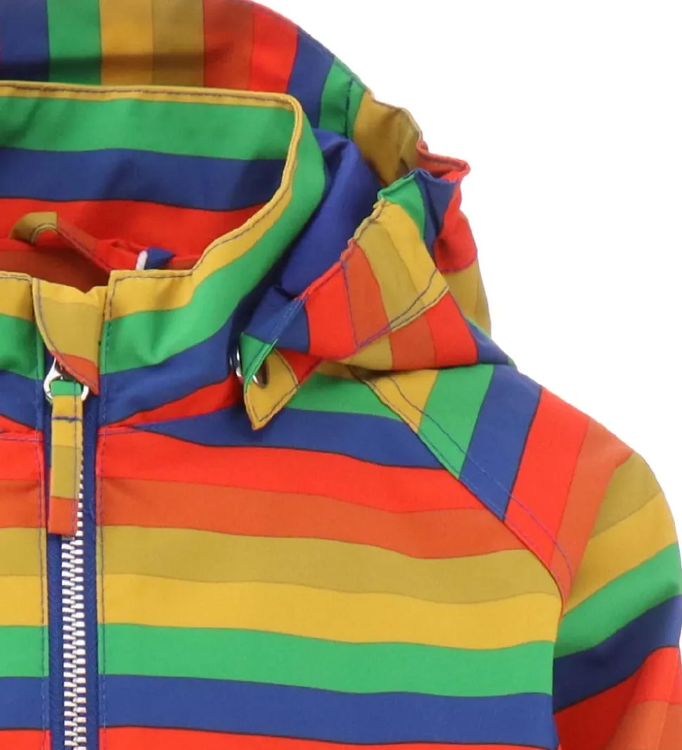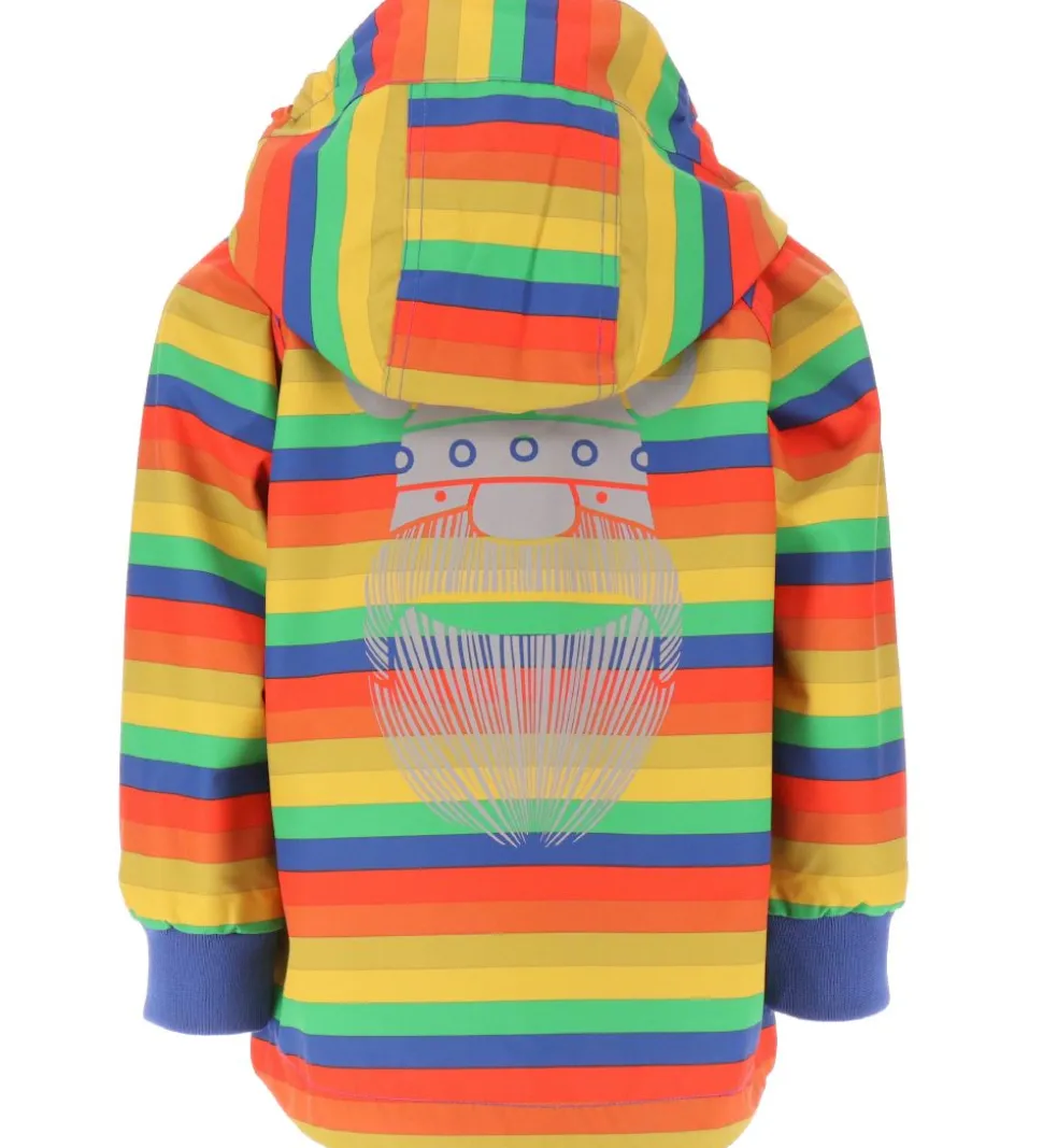 Fin Danefæ sommerjakke med vandrette striber i rød, blå, grøn, gul, karrygul og rødbrun. På ryggen er der et stort refleksprint af en viking.