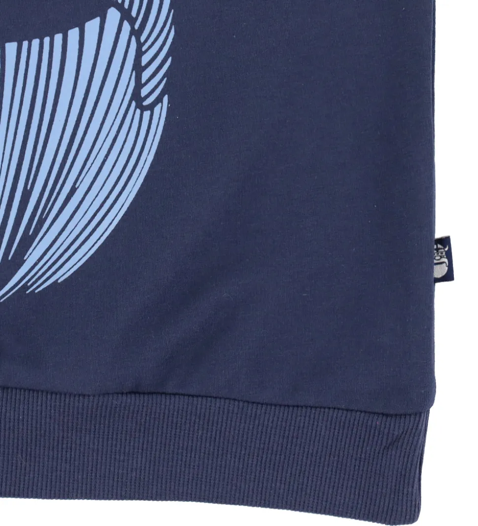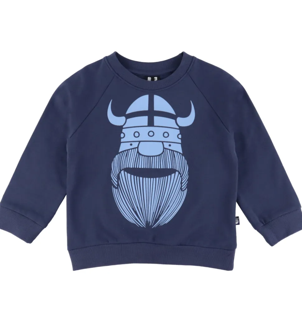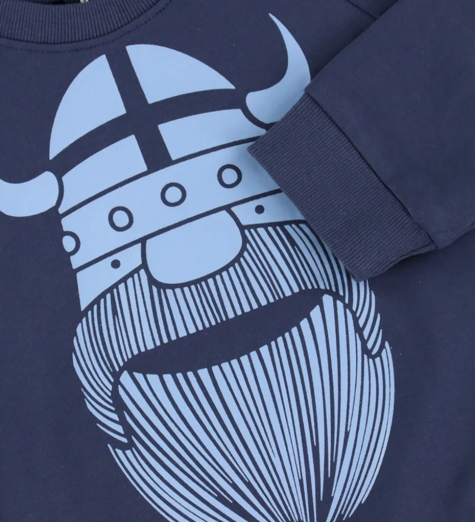 Charmerende Danefæ sweatshirt i navyblå med et stort, lyseblåt vikingelogo på fronten. Danefæ sweatshirten har lange ærmer og en rund halsudskæring med ribkanter ved alle åbninger. Indvendigt er der blødt, børstet bomuld.