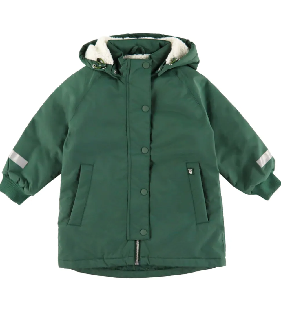 Funktionel Danefæ vinterjakke i mørkegrøn med refleksdetaljer på ærmerne og et stort refleksprint af en viking på ryggen. Vinterjakken har en aftagelig hætte, som sidder fast langs kravens kant med trykknapper. Den har brede ribkanter i ærmeåbningerne, og lukkes med en gennemgående lynlås foran med hagebeskytter og dobbelt vindtolpe, hvoraf den yderste kan lukkes med trykknapper. Foran er der en lomme i hver side. Indvendigt er der hvidt, imiteret uld i kroppen og i hætten, mens der er qulitet struktur i ærmerne.