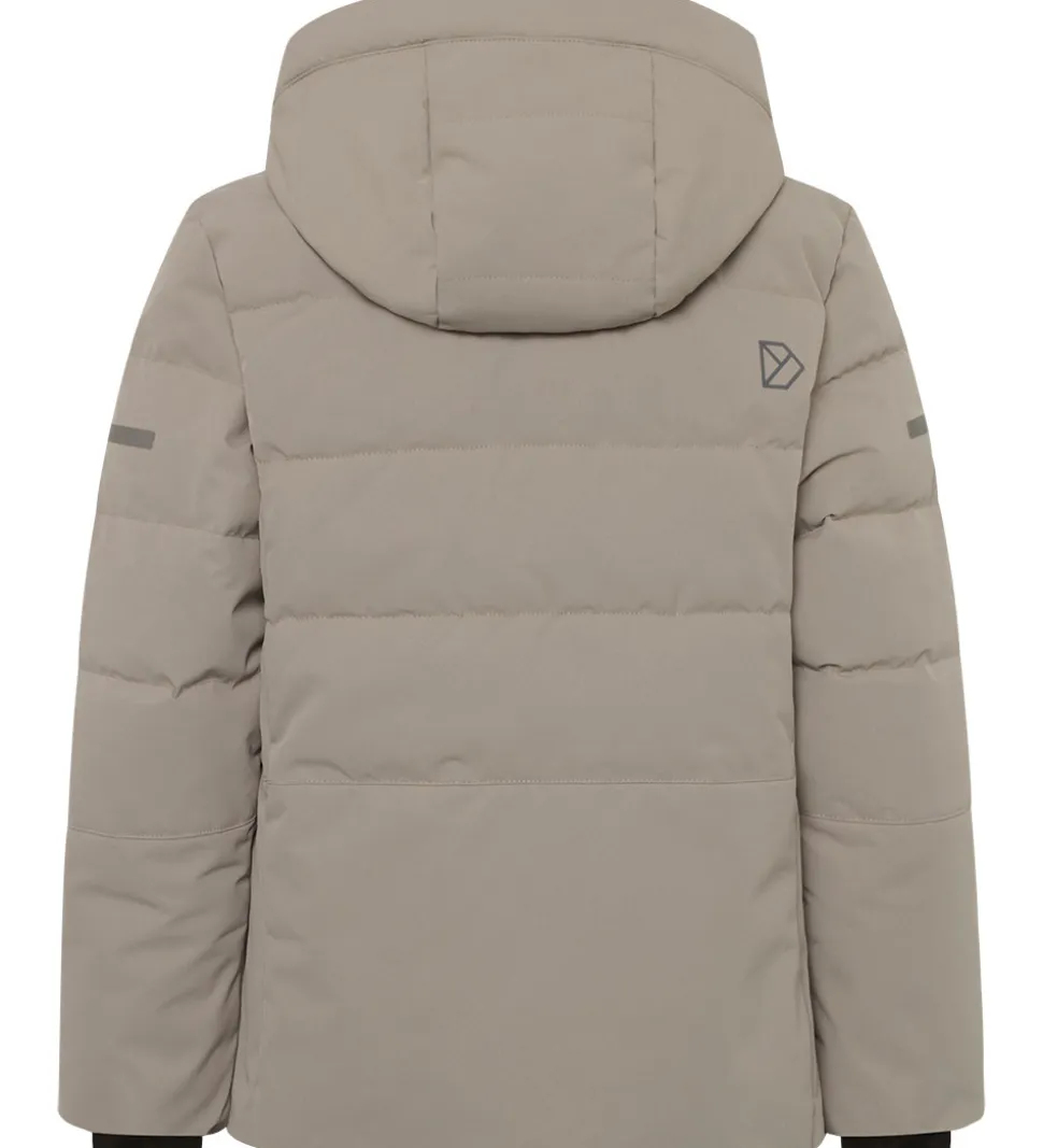 Skøn Didriksons dynejakke i beige med vandrette syninger og en sort logoapplikation på brystet samt velplacerede reflekser.