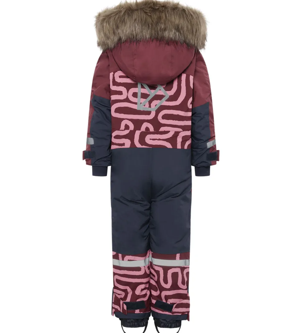 Flot Didriksons flyverdragt i mørk, støvet rød og navyblå og med et labyrintisk, rosa mønster. Flyverdragten har et broderet, hvidt logo på venstre bryst og velplacerede, praktiske reflekser.