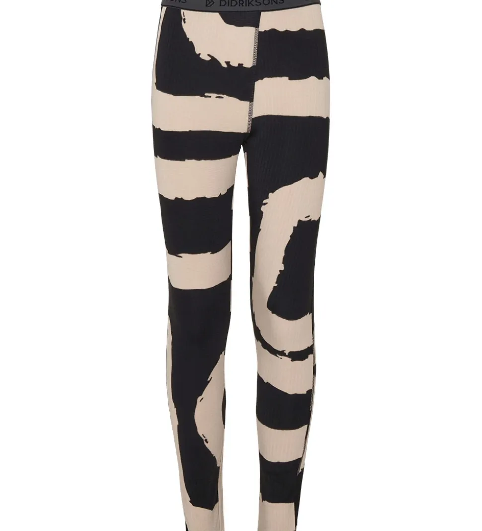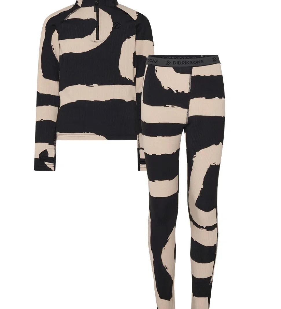 Lækkert Didriksons skiundertøj i sort med et beigefarvet mønster af brede, snoede striber. Sættet består af en bluse med lange ærmer og et par bukser.