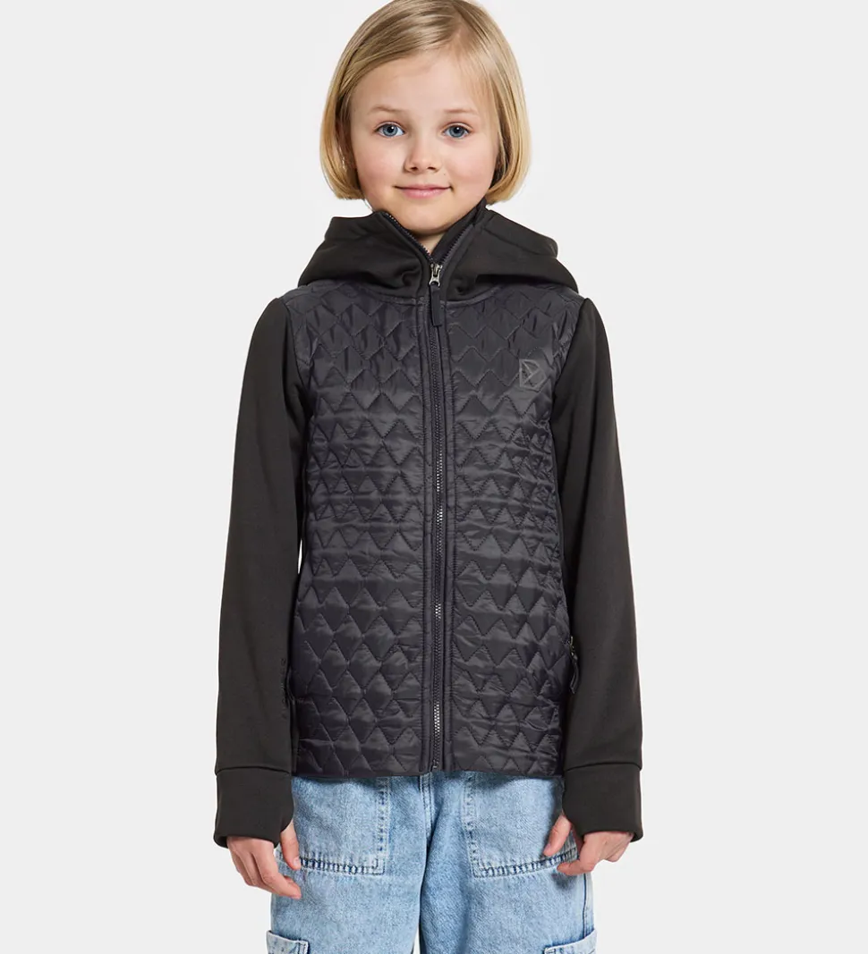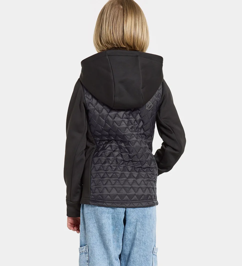 Lækker Didriksons softshelljakke i sort. Kroppen er i et glatvævet materiale med en bølgende, quiltet struktur, mens resten er i softshell.