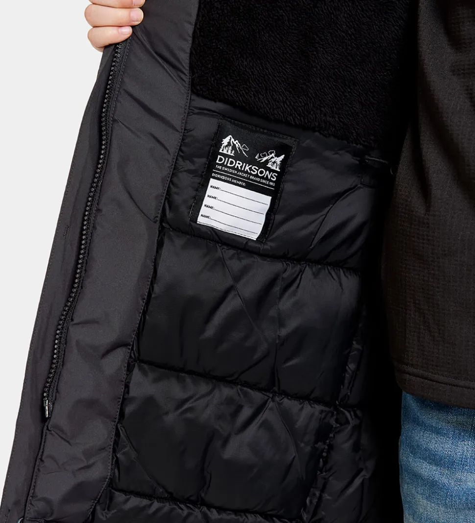Didriksons vinterjakken er en lang model,som går godt ned over numsen. Den har en aftagelig hætte, som sidder fast med trykknapper samt velcro fortil, og i toppen kan den justeres med en velcrorem. Kanten af ærmerne kan strammes ind med en velcrorem. I livet kan vinterfrakken strammes ind med en elastiksnøre på indersiden.