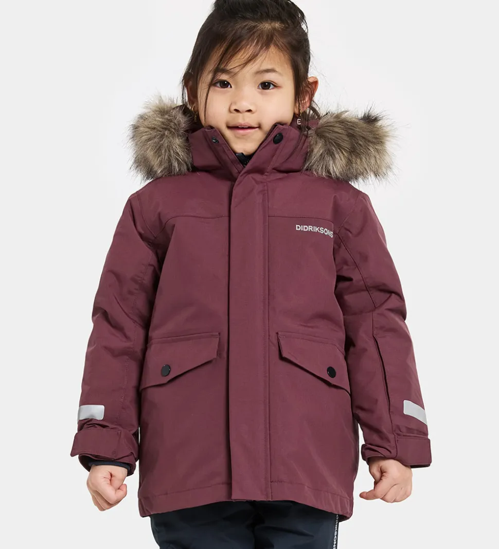 Sej Didriksons vinterjakke i mørk, støvet rød. Hætten har en flot kant af imiteret pels. Vinterjakken har praktiske reflekser yderst på ærmerne og et stort refleksprint på ryggen.