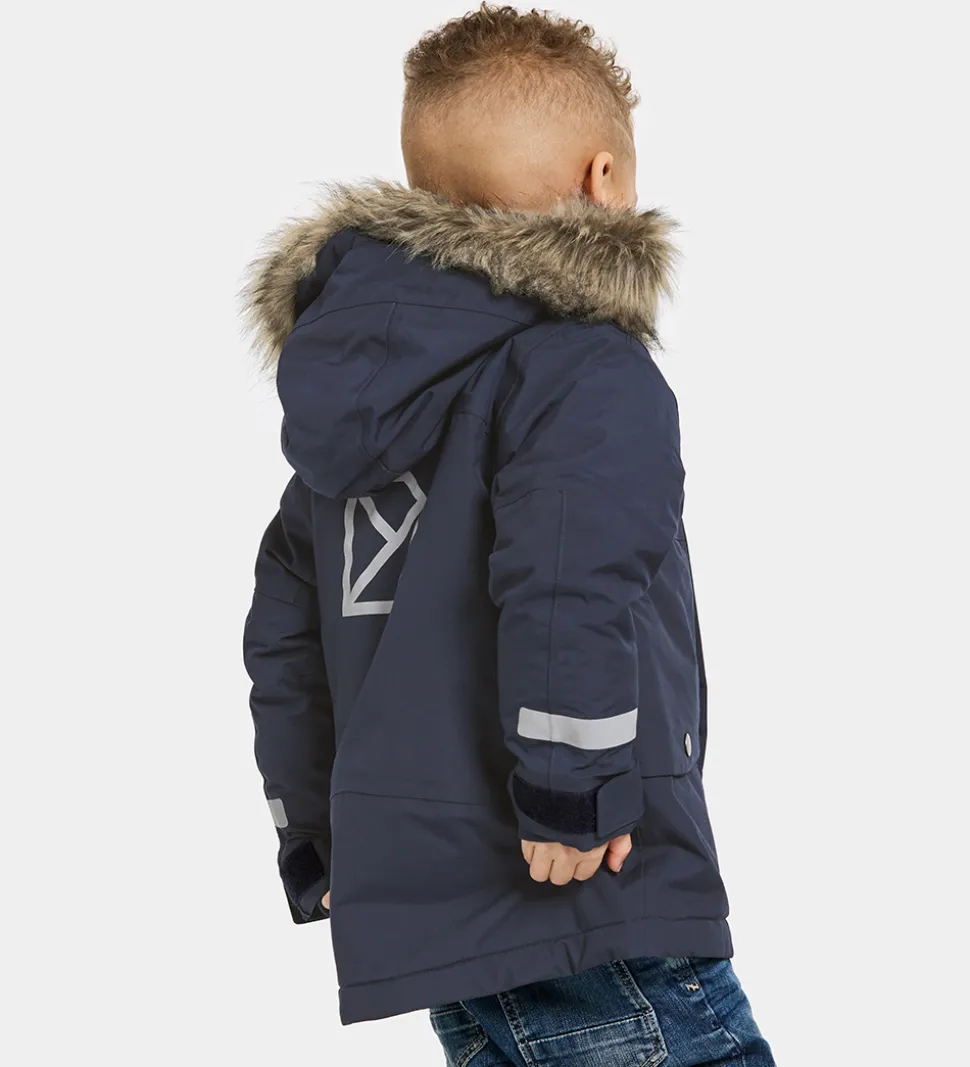 Flot Didriksons vinterjakke i navyblå med broderet logo og et stort logorefleksprint på ryggen. Hætten har en fin kant af aftageligt, imiteret pels i brun.