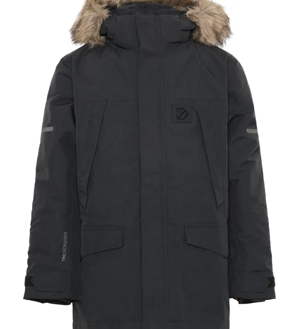 Didriksons vinterjakken er godt vatteret og har et glatvævet for med vandrette syninger.