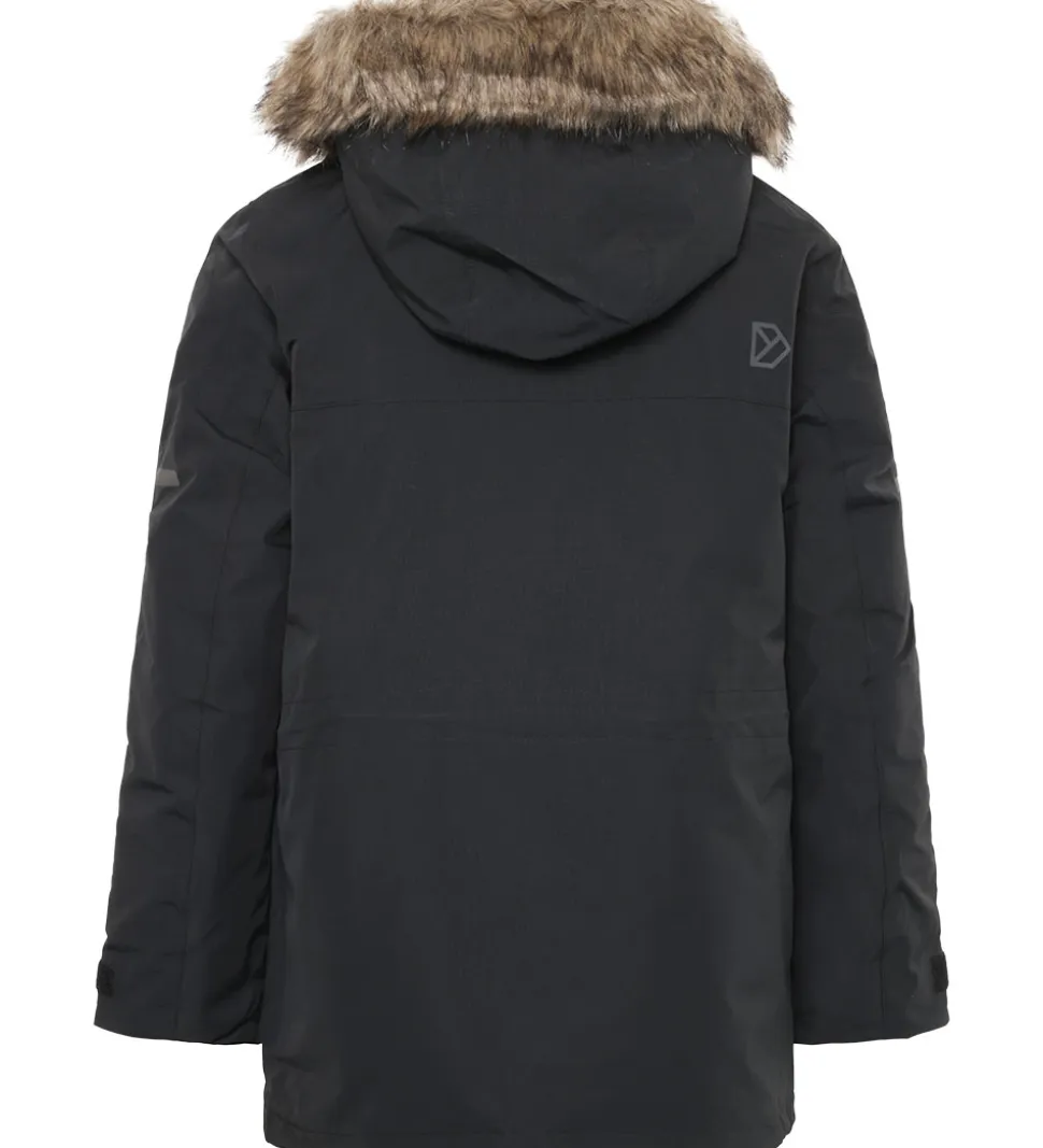 Didriksons vinterjakken har en aftagelig hætte, som er fæstnet med trykknapper langs den høje krave. På indersiden af kraven er der en blød ribkant. Hætten har en flot, imiteret pelskant, der kan tages af ved hjælp af skjulte trykknapper. I toppen kan hætten justeres med velcro.